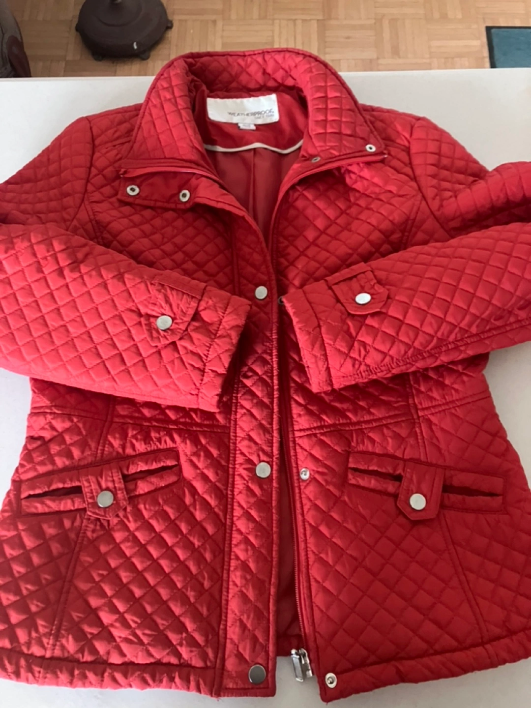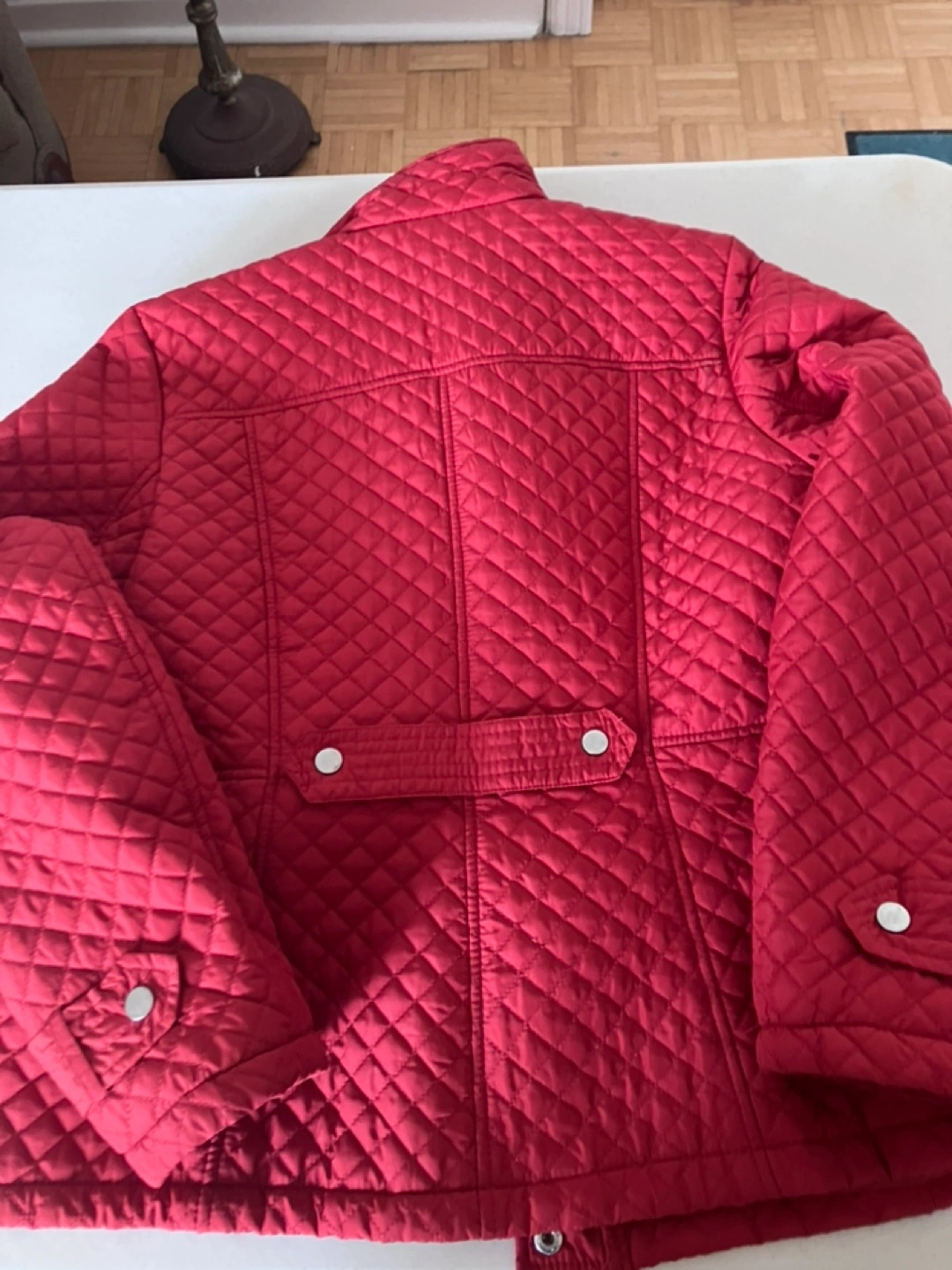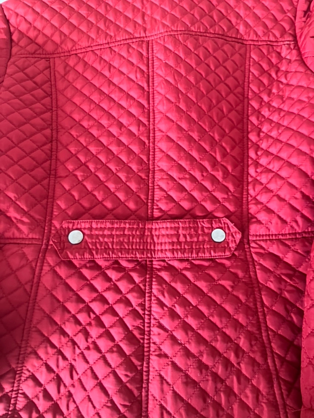 Women's red quilted jacket. Size medium. Features a classic diamond pattern, zipper closure, and pockets. Lightweight and warm.