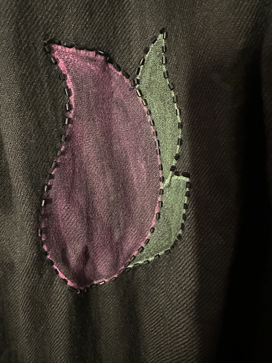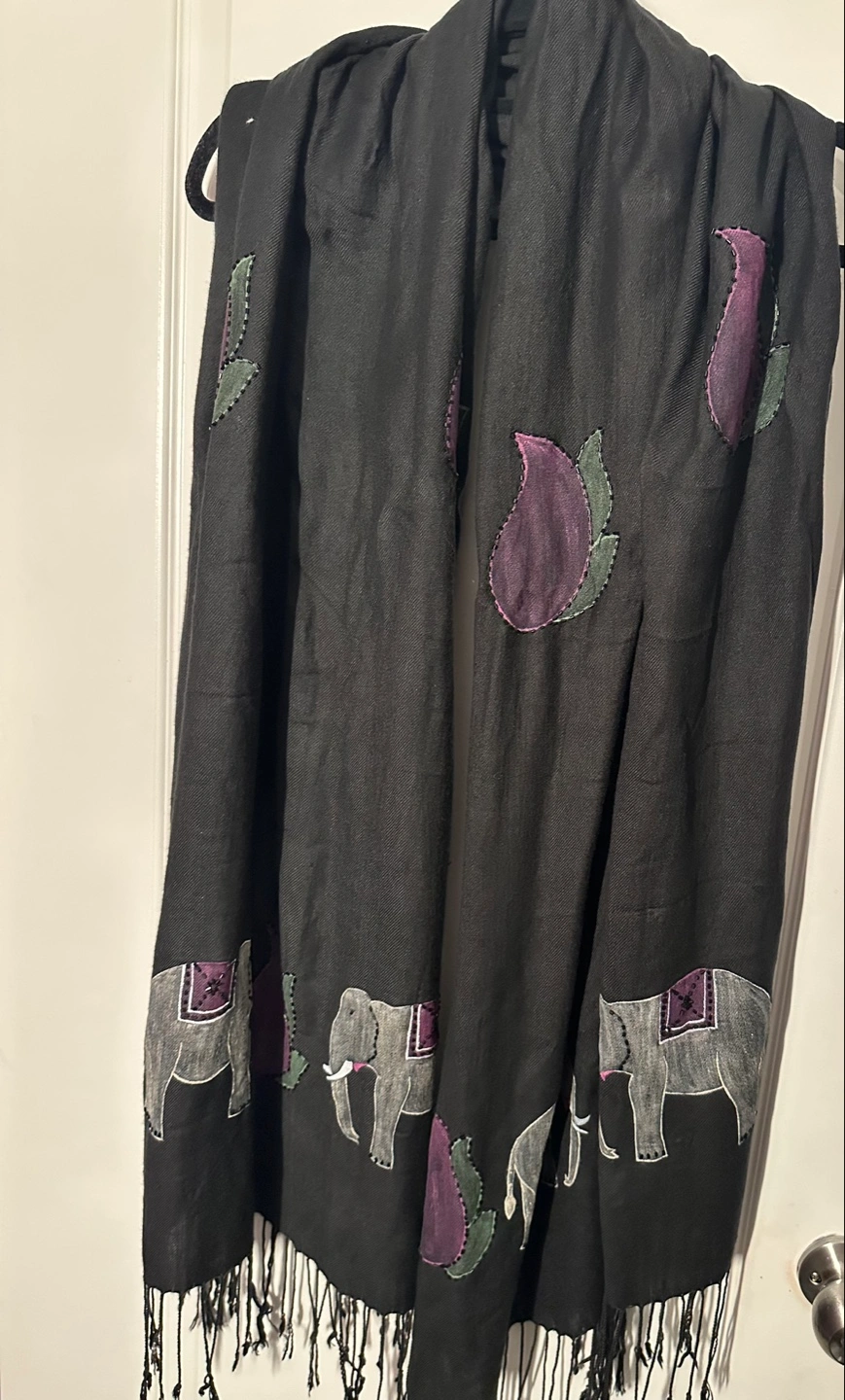 Versatile black shawl/scarf features hand-painted elephants with beaded accents.