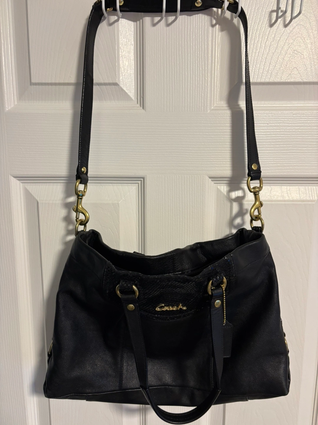 Genuine Black leather Coach purse. Features two top handles and a long shoulder strap. Gold-tone hardware. Interior lining. Roomy main compartment.