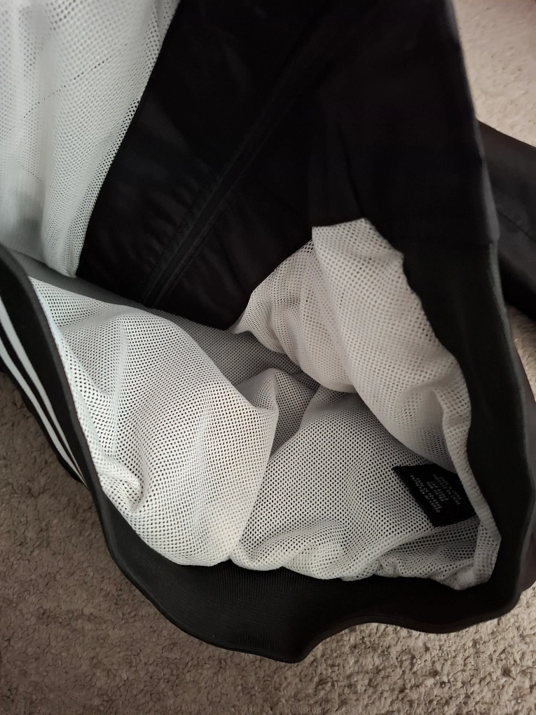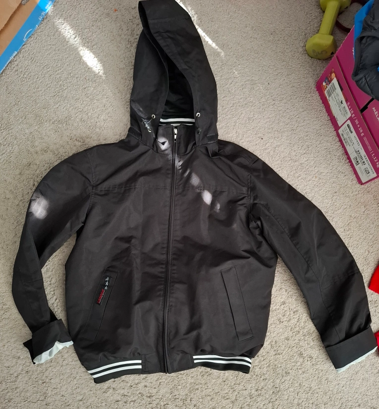 Men's black hooded jacket. Features white stripes on the cuffs and hem. Full zip closure. Mesh lining. Lightweight, perfect for layering.