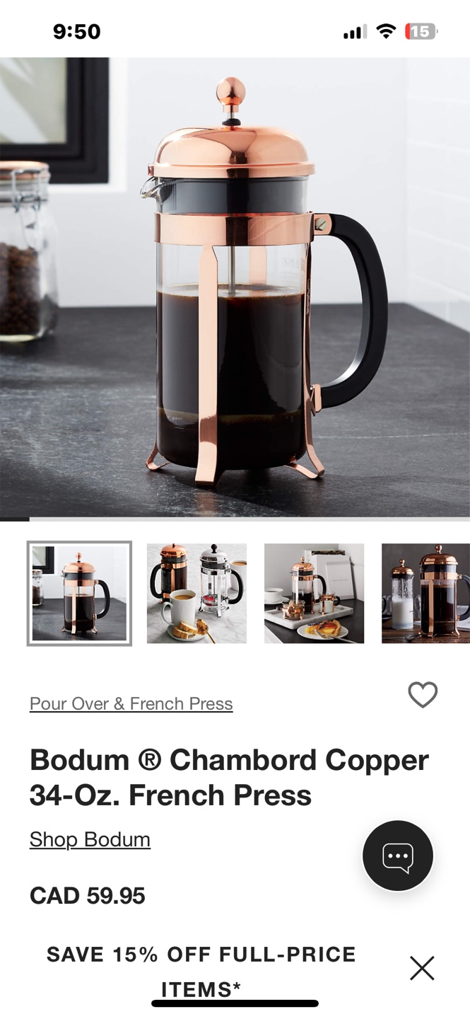 1 / 31 / 3Buy & Sell💚Bodem Copper French Press 34-oz💚Bodem Copper French Press 34-oz$10Copper-toned French press. Glass and copper construction. Black handle. 34-ounce capacity. Good condition. Tea added to show sizeConditionLike newWHERE TO MEETSaint George Street & Bloor Street WestView MapSELLERverifiedJosephineAnnex1000+99 reviews1 chats·2 favorites·57 viewsSEND CHAT TO SELLERHi Josephine! I’m interested in your listing.Hi Josephine! I’m interested in your listing.Get the Karrot app to chatSign In to chat