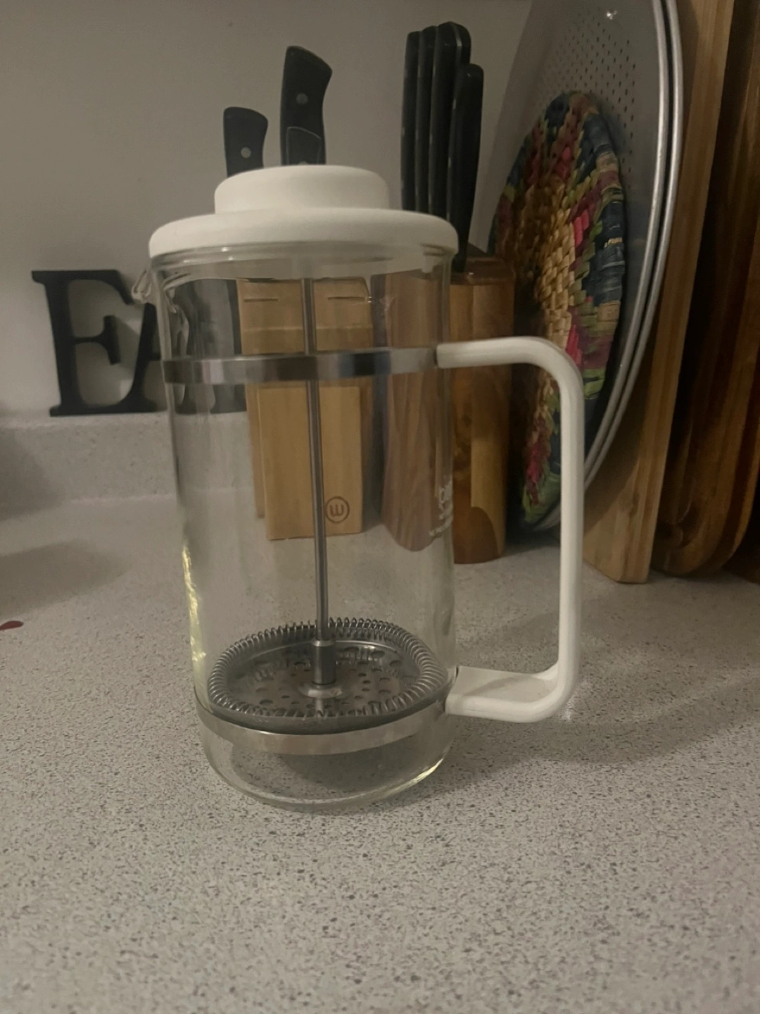 Glass French press coffee maker. White plastic lid and handle. Metal filter and plunger. Great for making coffee or tea. Tea added to demonstrate size. Believe it is 17oz