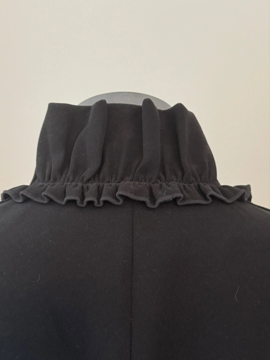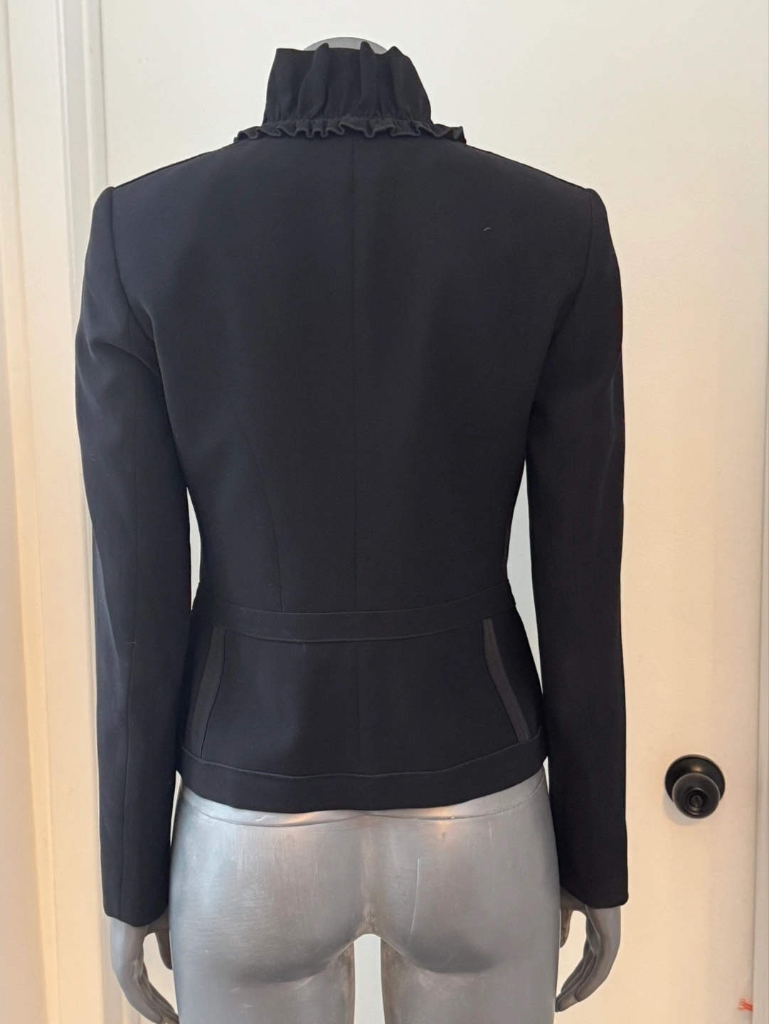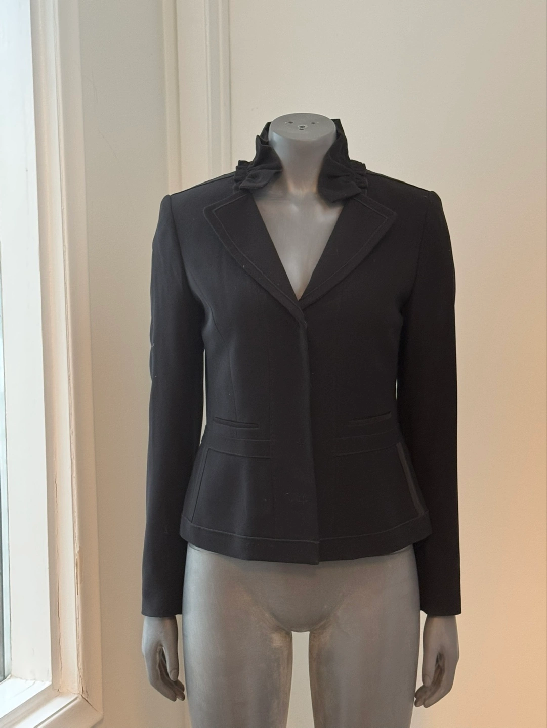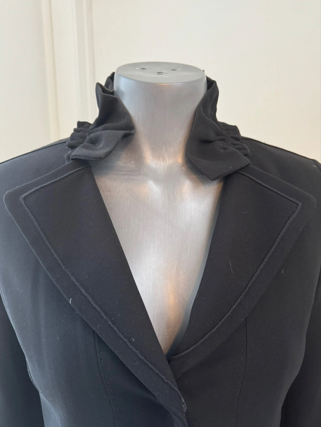 Elegant black blazer. Features a fitted silhouette, long sleeves, and a unique ruffled collar. Single-breasted closure. Two front pockets. Suitable for professional or evening wear.