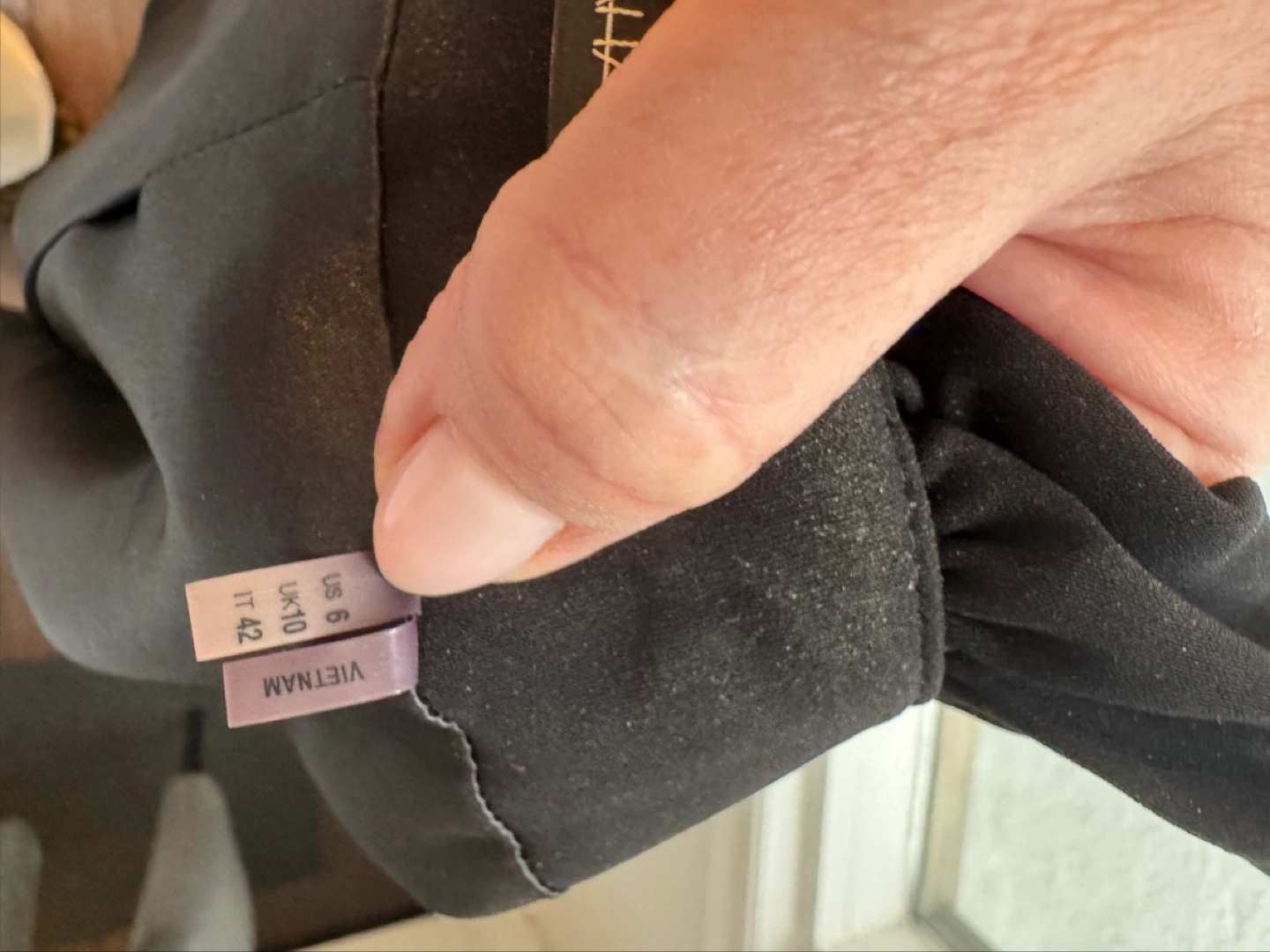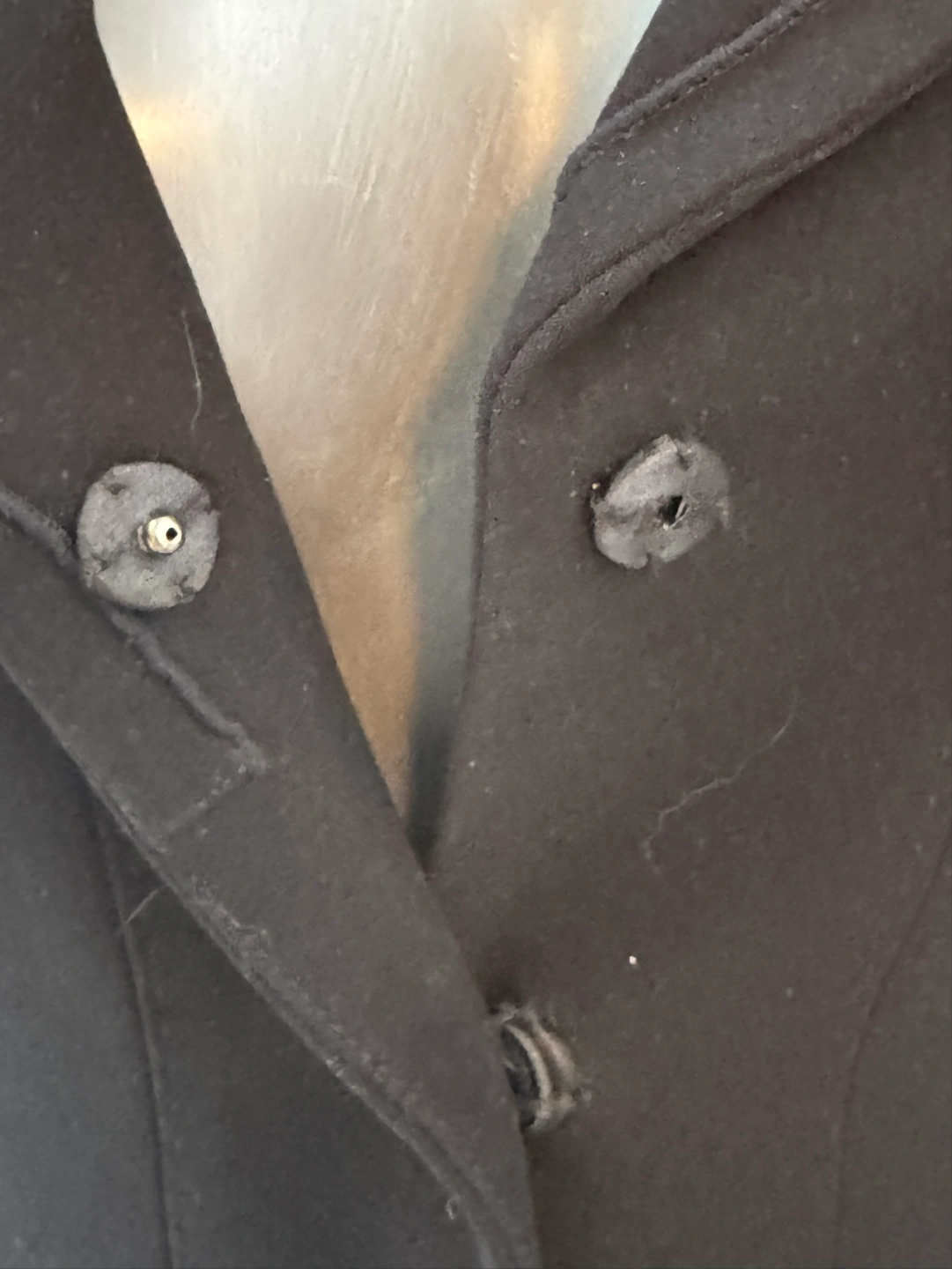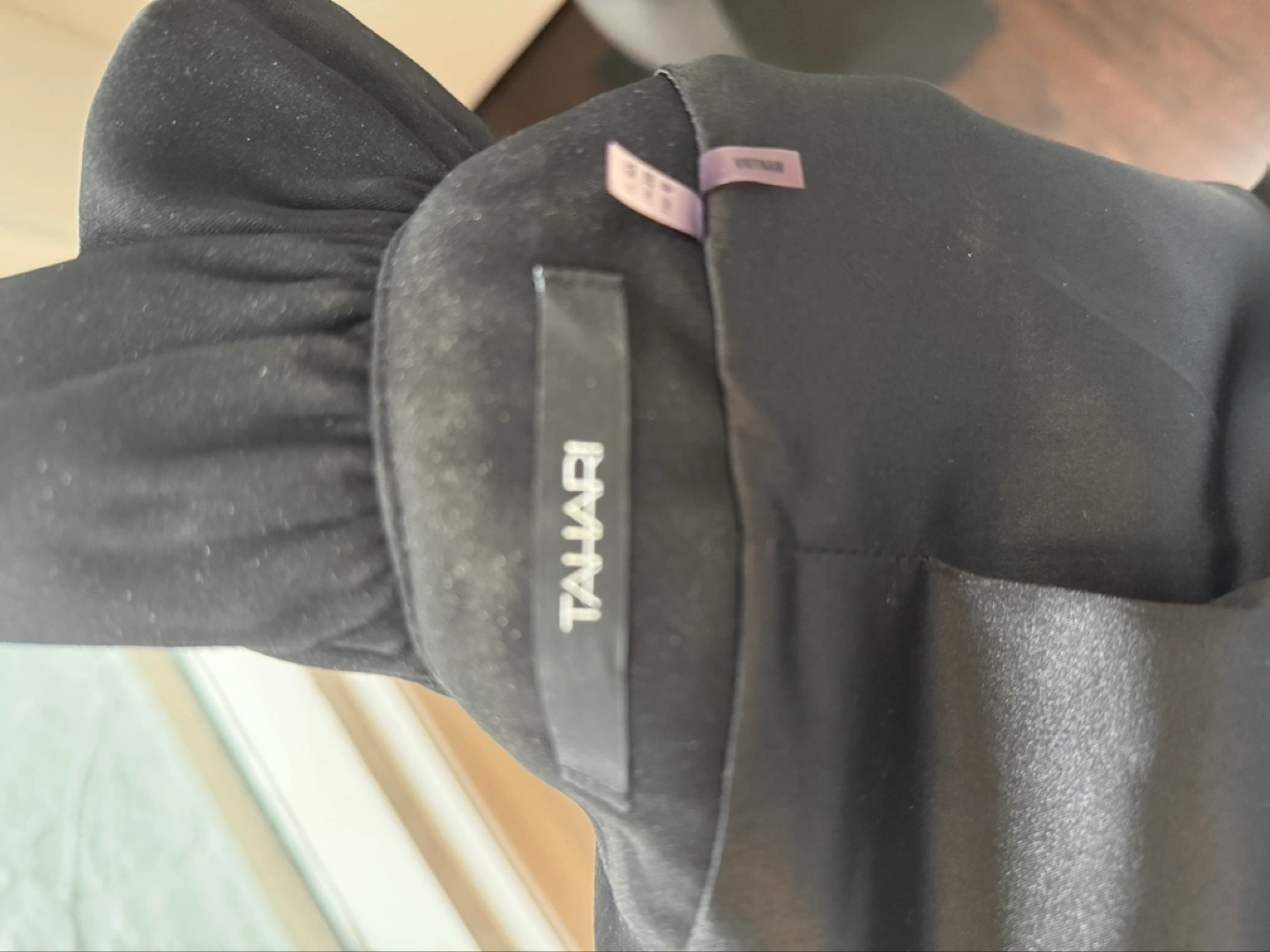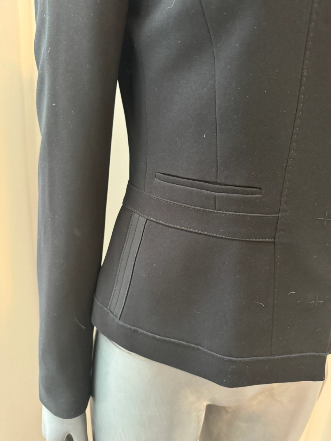 Elegant black blazer. Features a fitted silhouette, long sleeves, and a unique ruffled collar. Single-breasted closure. Two front pockets. Suitable for professional or evening wear.