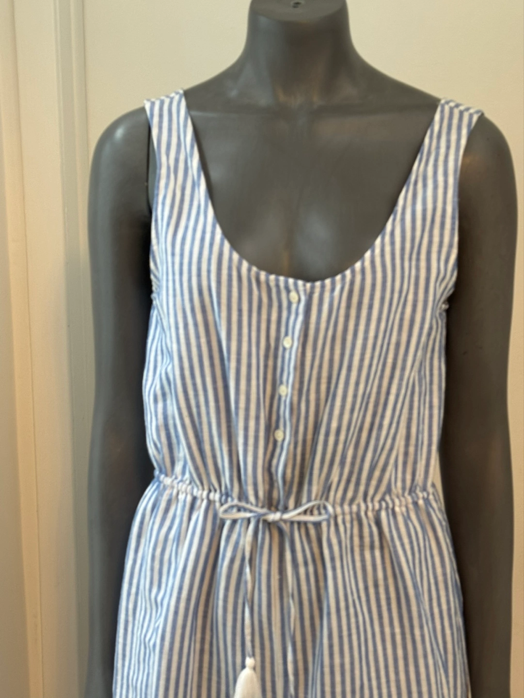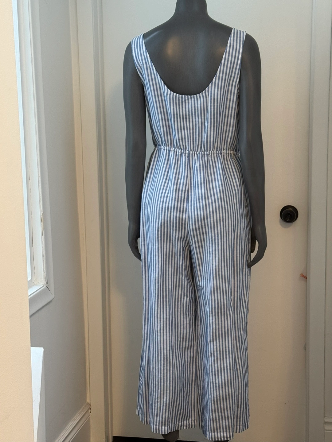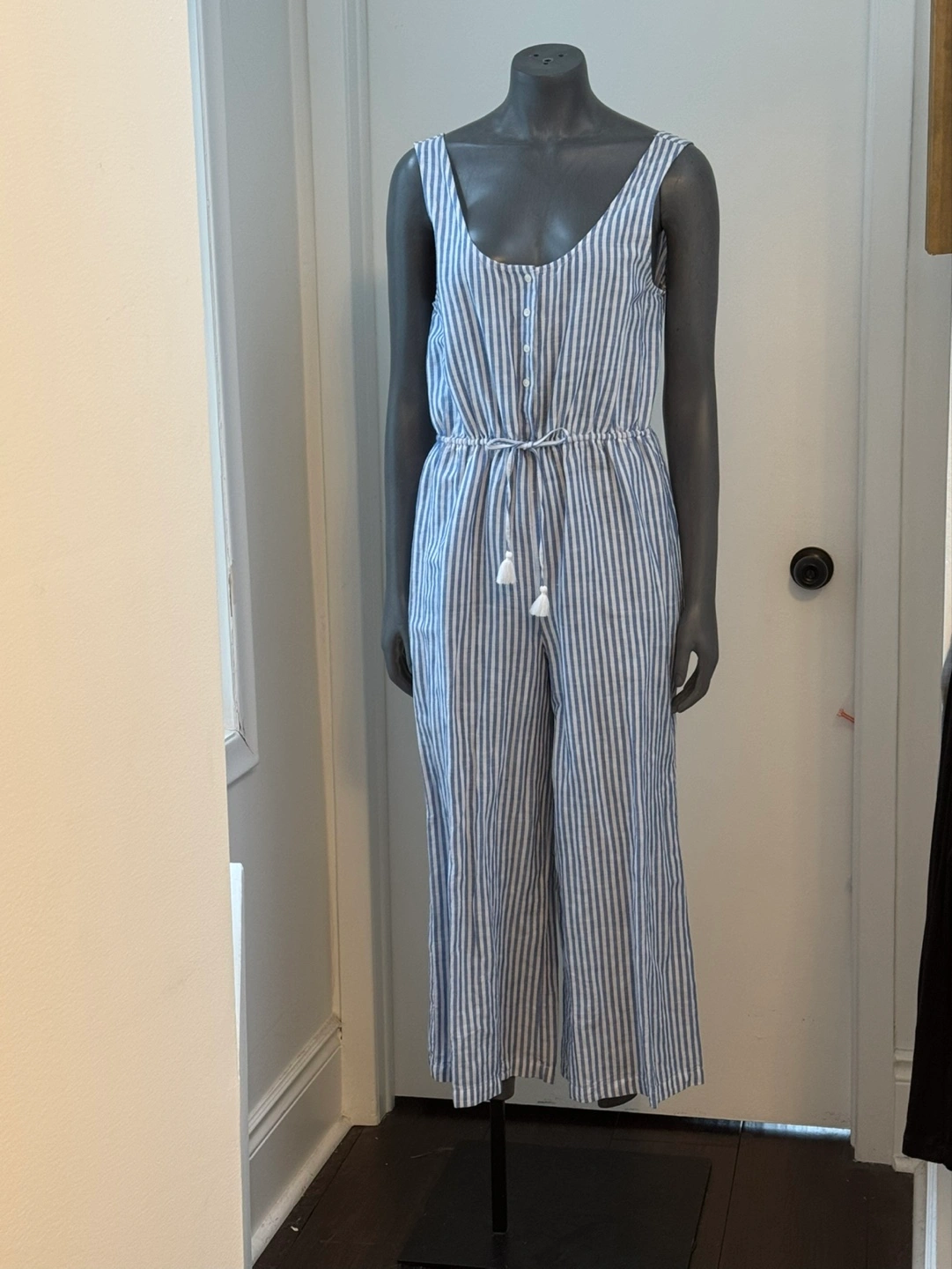 Size small, sleeveless jumpsuit. Features a drawstring waist and tassel detail. Button front closure. Made in Indonesia. Cotton and linen. Paid 225usd. NWT