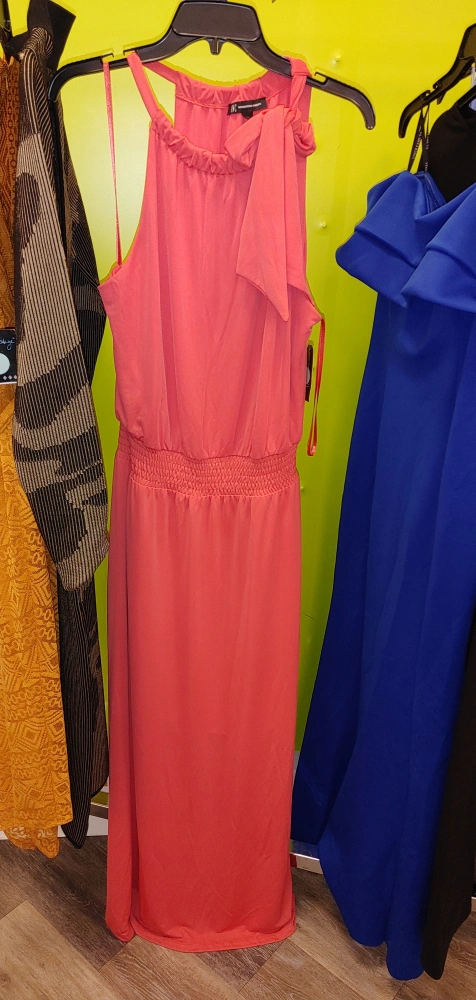 Flowy coral maxi dress. Features halter neck and empire waist. Lightweight material, perfect for summer.