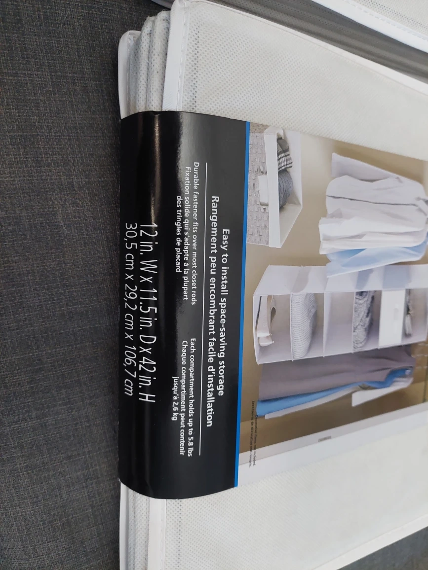 Mainstays 6 Compartment Closet Organizer, 6-shelf hanging closet organizer, white, Product size: 12 in. W x 11.5 in. D x 42 in. H https://www.walmart.ca/ip/6000199611295