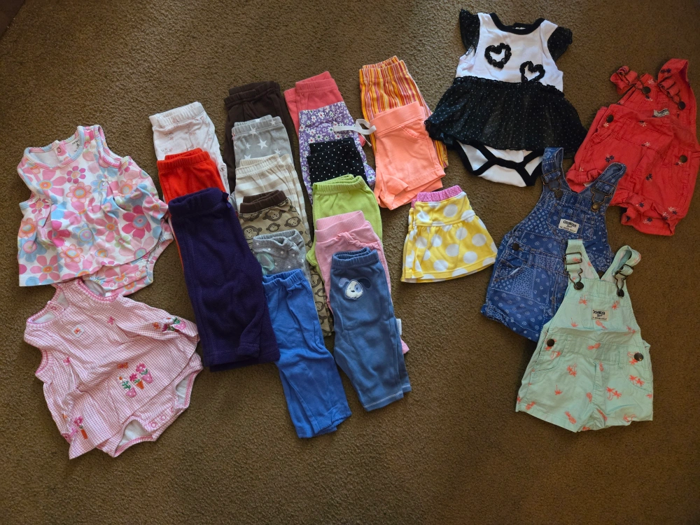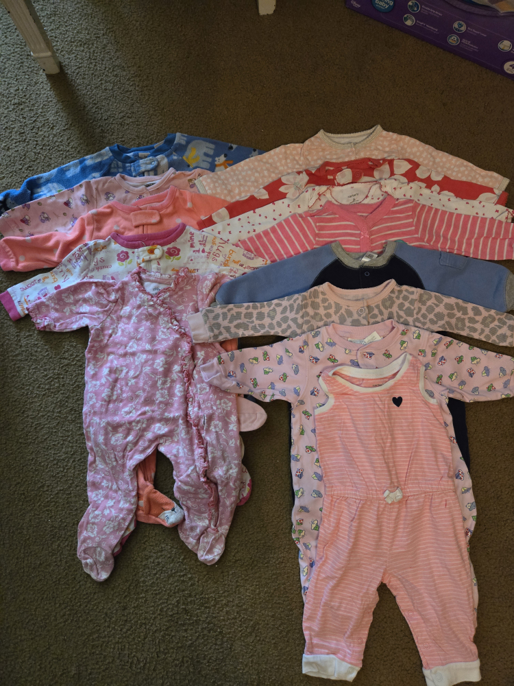 Large bundle of baby girl clothes (over 60 peices), size 6 months. Includes tops (long & short sleved), bottoms, overalls, sleepsuits (with & without feet) and more. Variety of colours and patterns. Perfect for a new baby or to supplement an existing wardrobe.