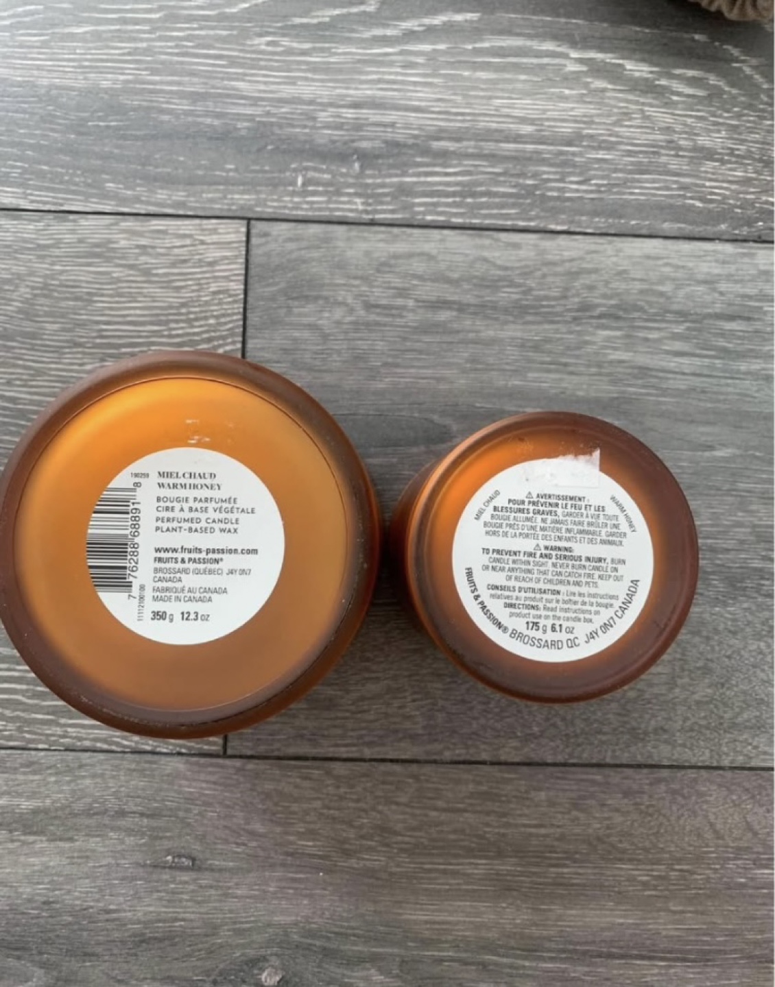 -Two Aura Fruits & Passion scented candles. Amber coloured glass jars. One larger, one smaller. Includes a small fabric bag.