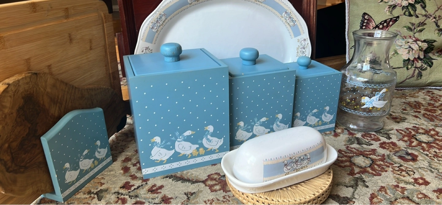 3 Canisters 1 Napkin Holder- great for cutting boards 1 Butter Dish 1 Anchor Hocking juice container Perfect for kitchen or pantry storage.