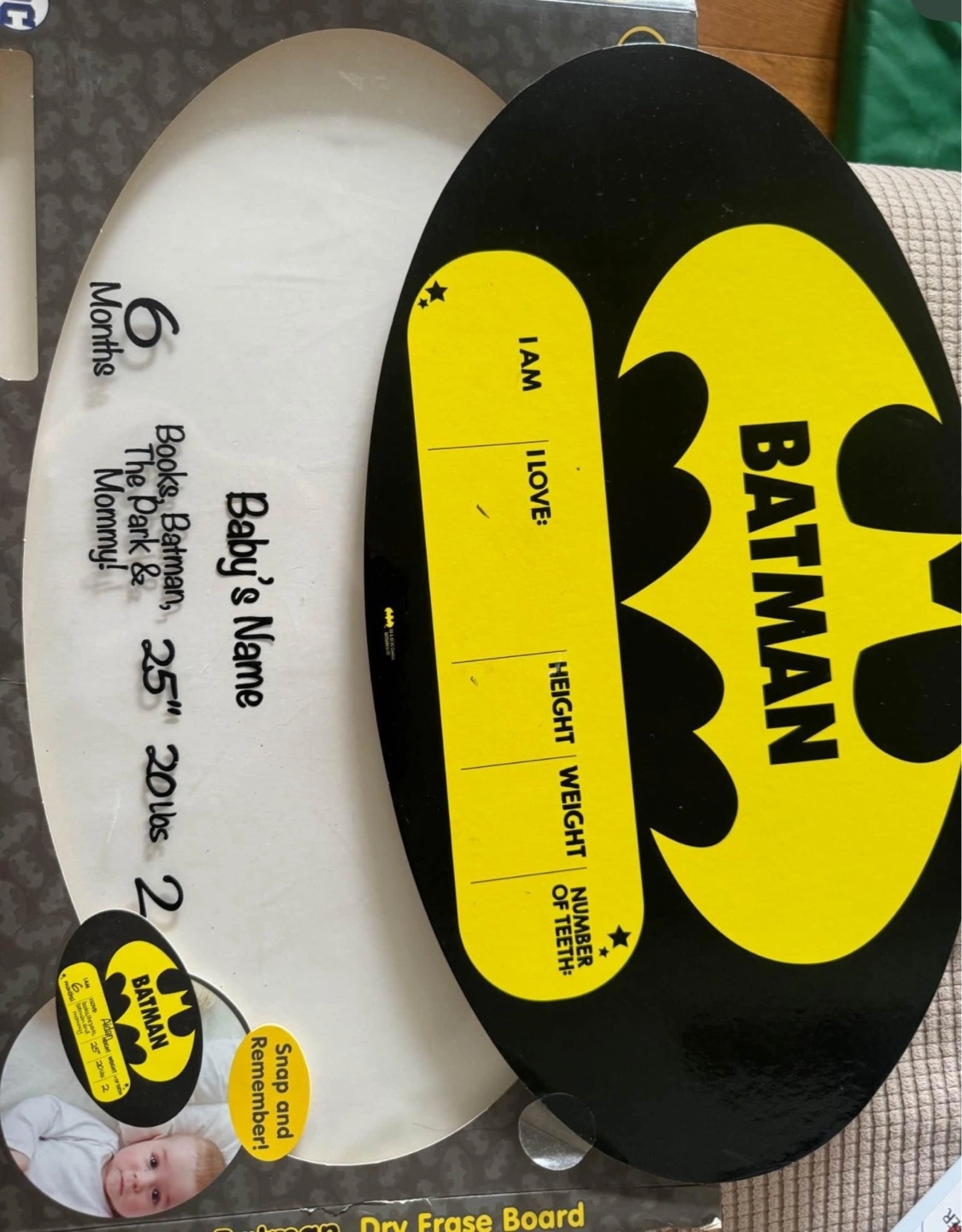 Baby milestone board. Features Batman theme. Dry erase surface. Includes spaces for name, height, weight, number of teeth, and more.