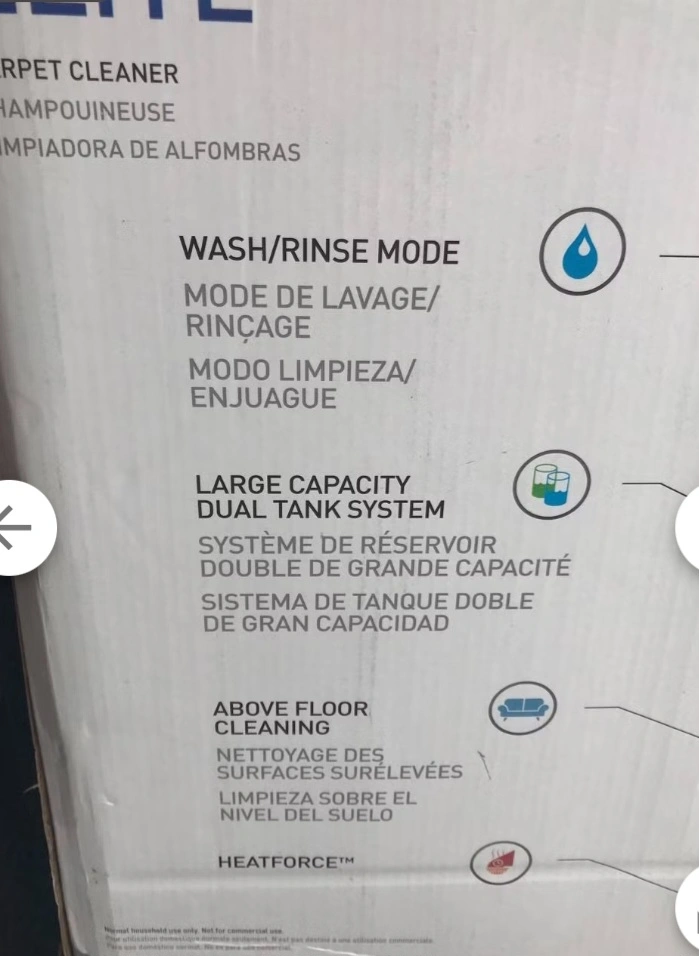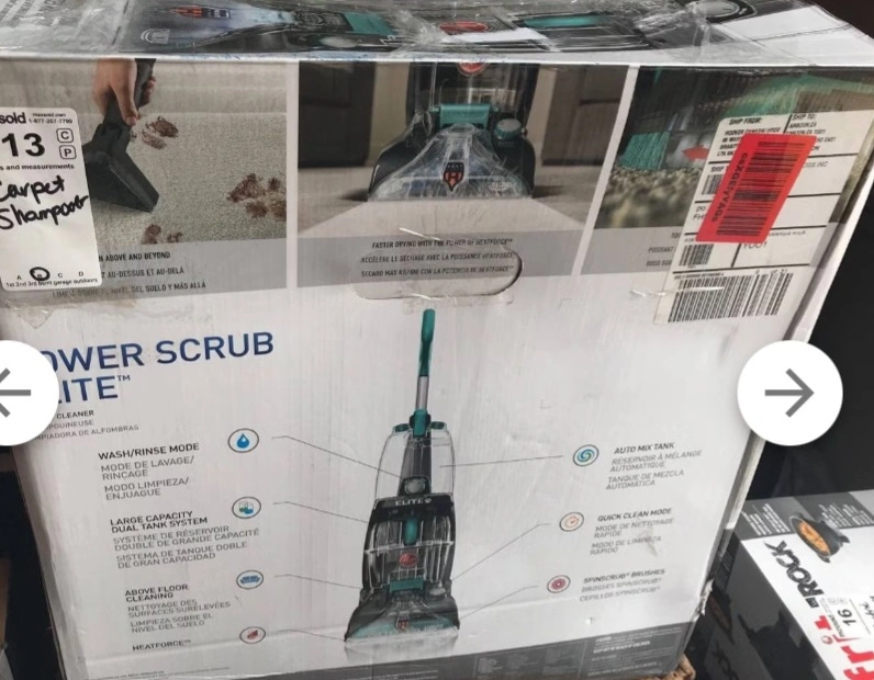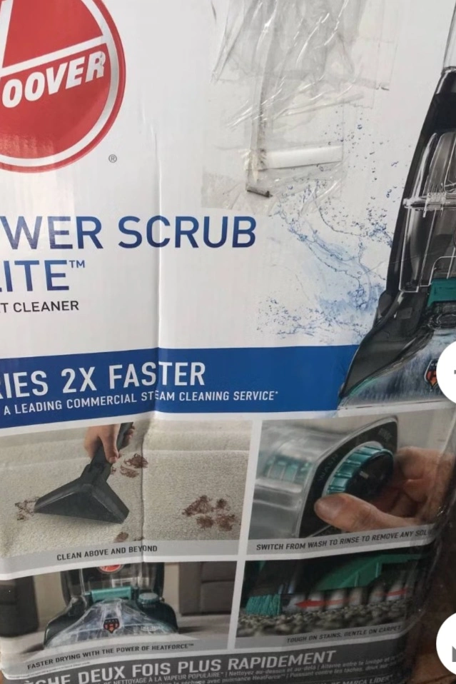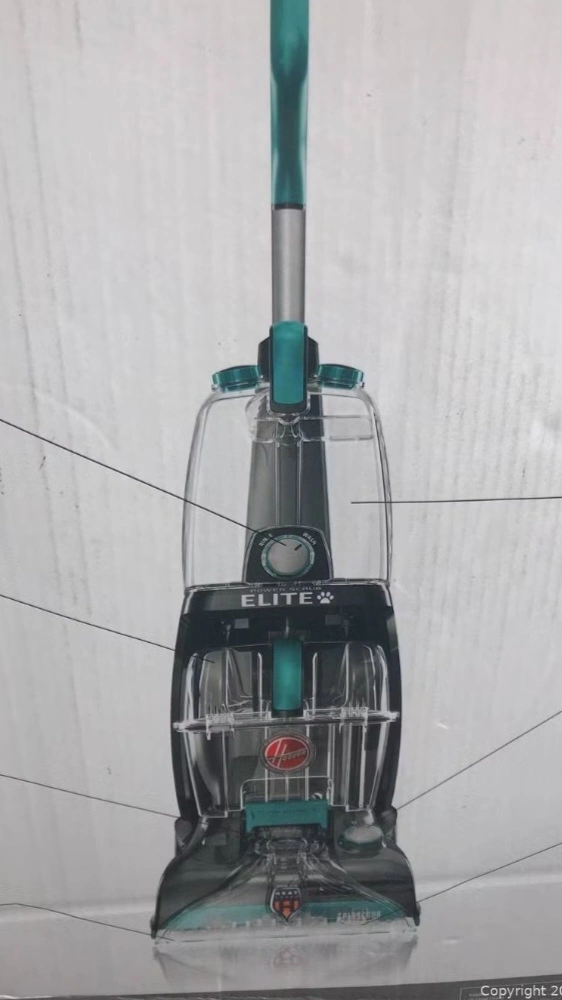 New Hoover Power Scrub Elite carpet cleaner. Features auto mix tank, quick clean mode, spinscrub brushes, wash/rinse mode, large capacity dual tank system, and above floor cleaning. Heats up quickly. Teal and grey.
