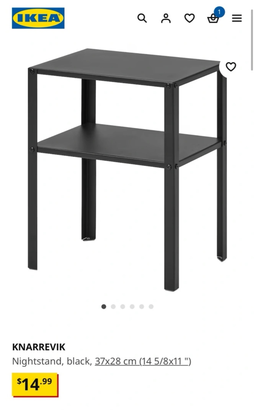 1 / 41 / 4Buy & SellIKEA Knarrevik Black NightstandIKEA Knarrevik Black Nightstand$10-Small black metal nightstand -Good condition -Original price:$15 without taxDimensions37 x 28 x 44.5WHERE TO MEETM4Y 1L1View MapSELLERverifiedEttyYorkville25218 reviews13 chats·11 favorites·346 viewsSEND CHAT TO SELLERHi Etty! I’m interested in your listing.Hi Etty! I’m interested in your listing.Get the Karrot app to chatSign In to chat