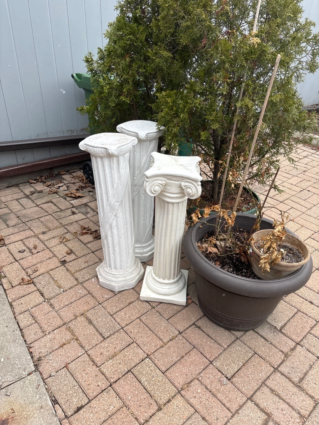 Three white pedestals, varying heights. Classic column design. Perfect for indoor or outdoor use. Some minor wear.