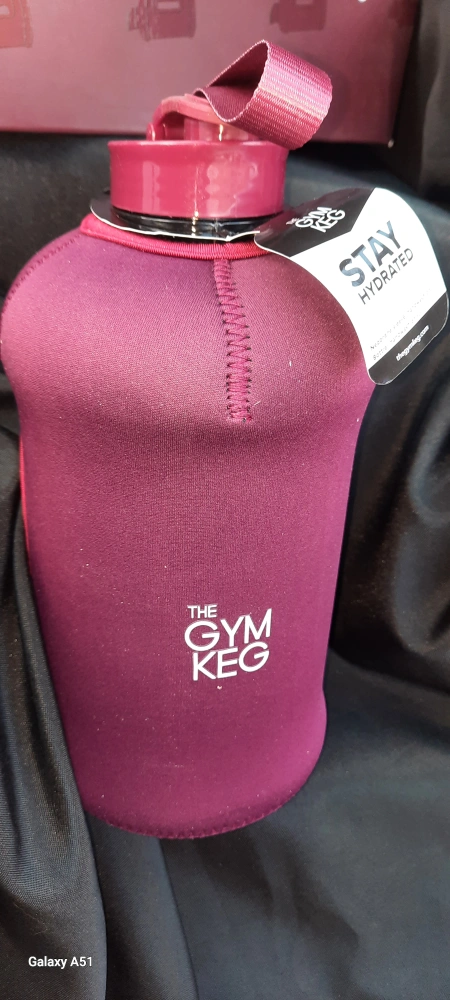 New in box. Maroon Gym Keg water bottle. 2.2 litre capacity. BPA free. Protective cooling case. Reinforced design. Pop cap.