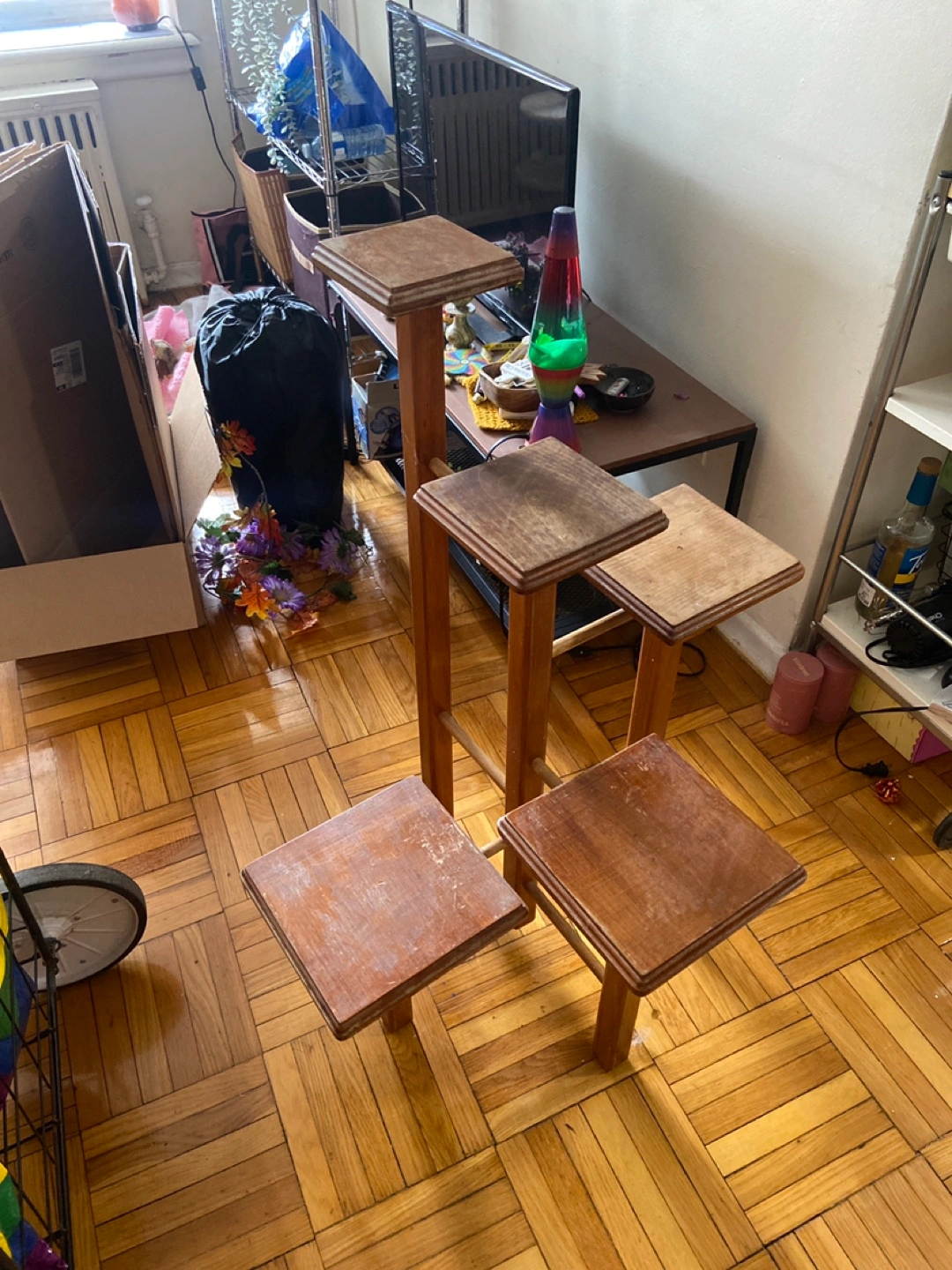 The wood is a little weathered, but the plant stand is still functional and sturdy.
