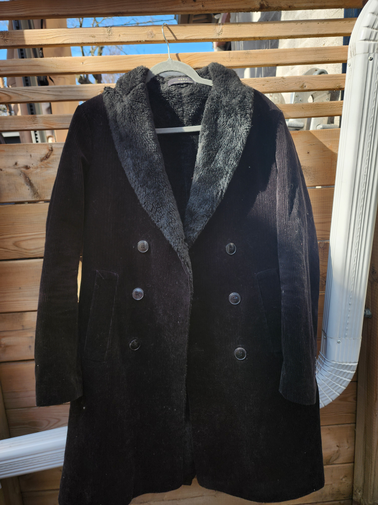 Women's long black corduroy coat. Features a double-breasted closure and a faux fur collar. Long sleeves. Made in Turkey.