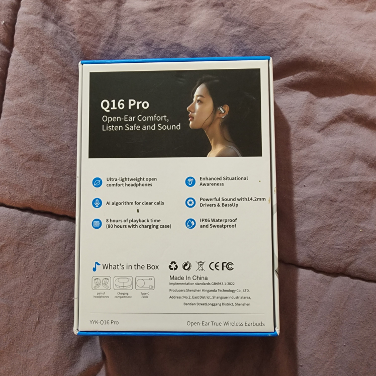 New open-ear earbuds. IPX6 waterproof. 8 hours playtime, 60 hours with charging case. Includes charging case and instructions. Ultra lightweight and comfortable.