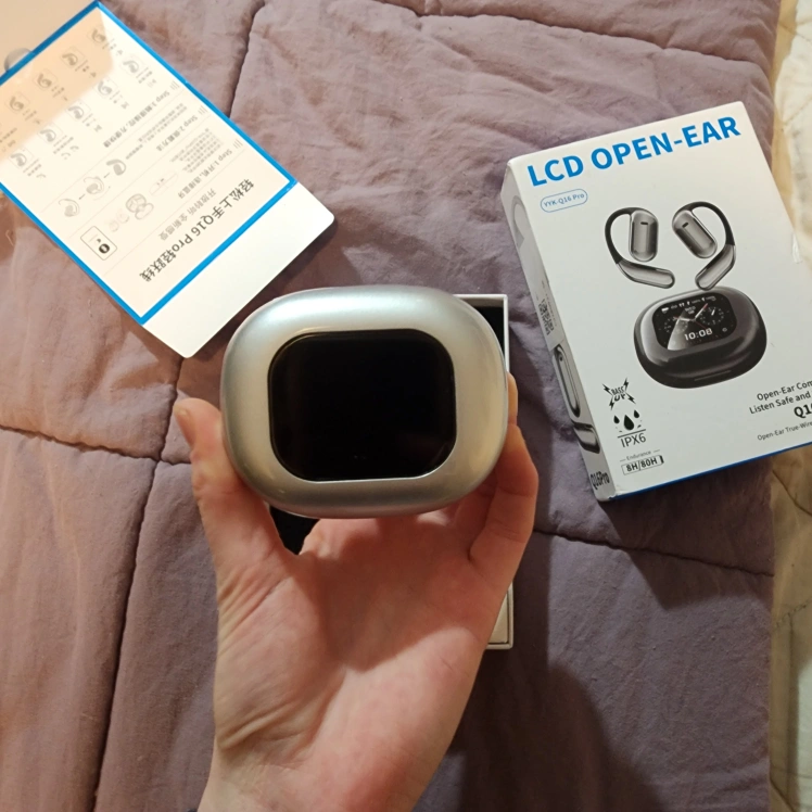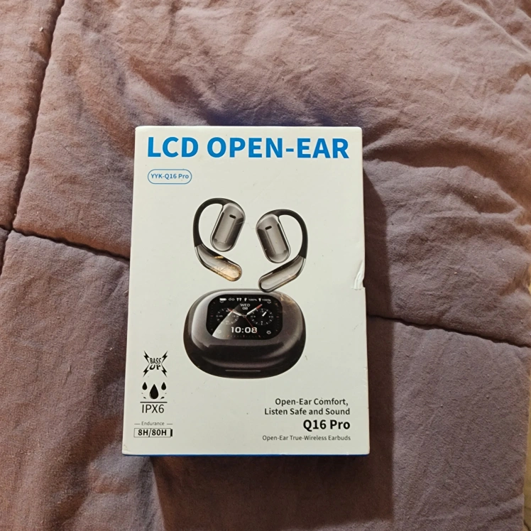 New open-ear earbuds. IPX6 waterproof. 8 hours playtime, 60 hours with charging case. Includes charging case and instructions. Ultra lightweight and comfortable.