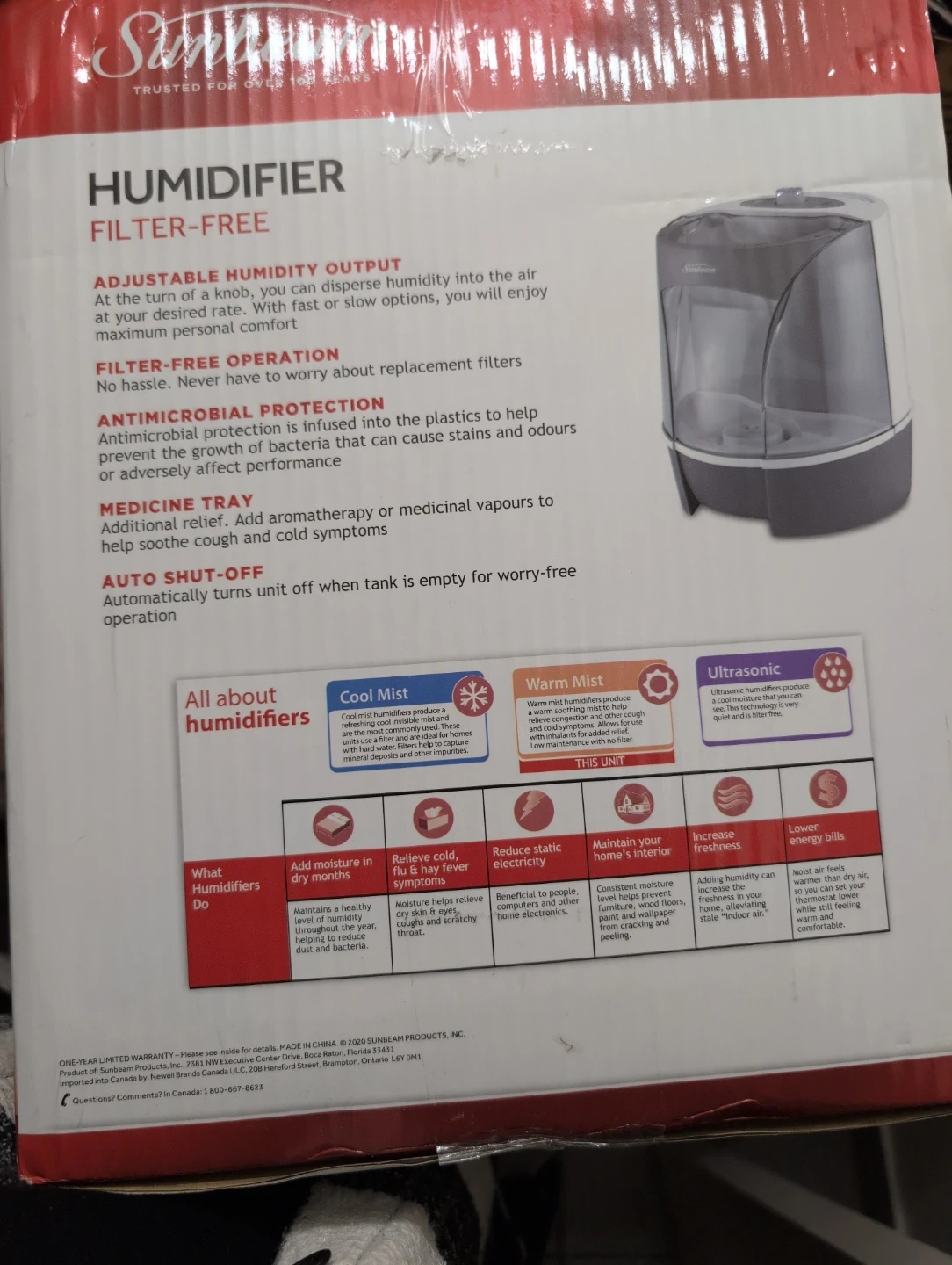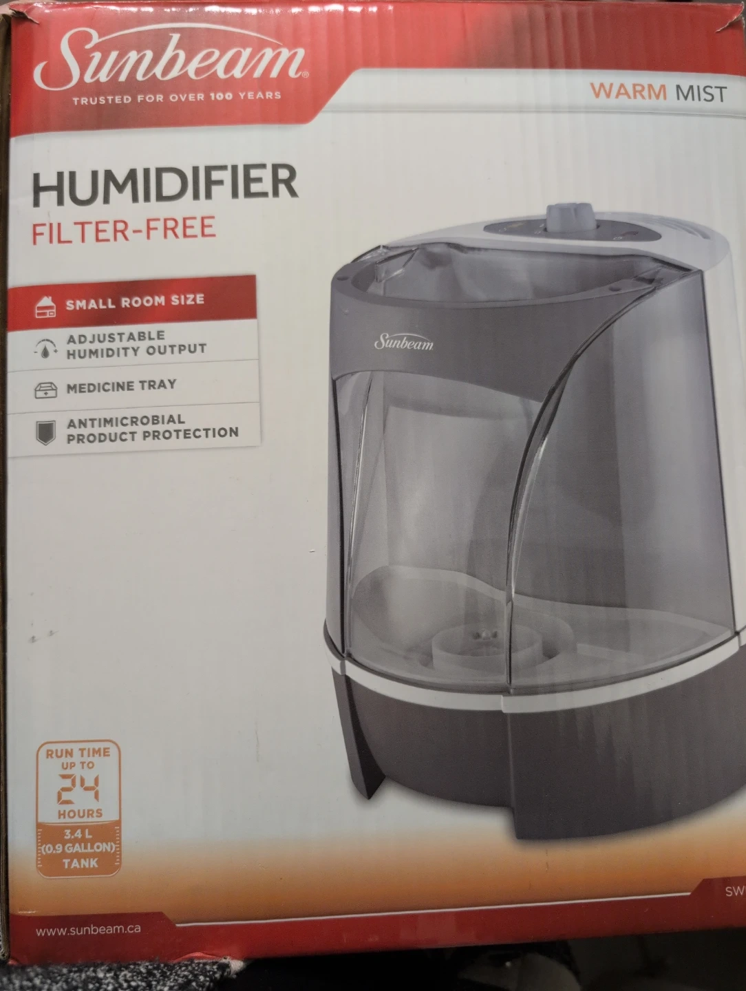 This Sunbeam filter-free warm mist humidifier is designed for small rooms. It offers adjustable humidity output and a medicine tray for aromatherapy. The unit automatically shuts off when empty. Light used and ready for a new home. Comes in it's original box.