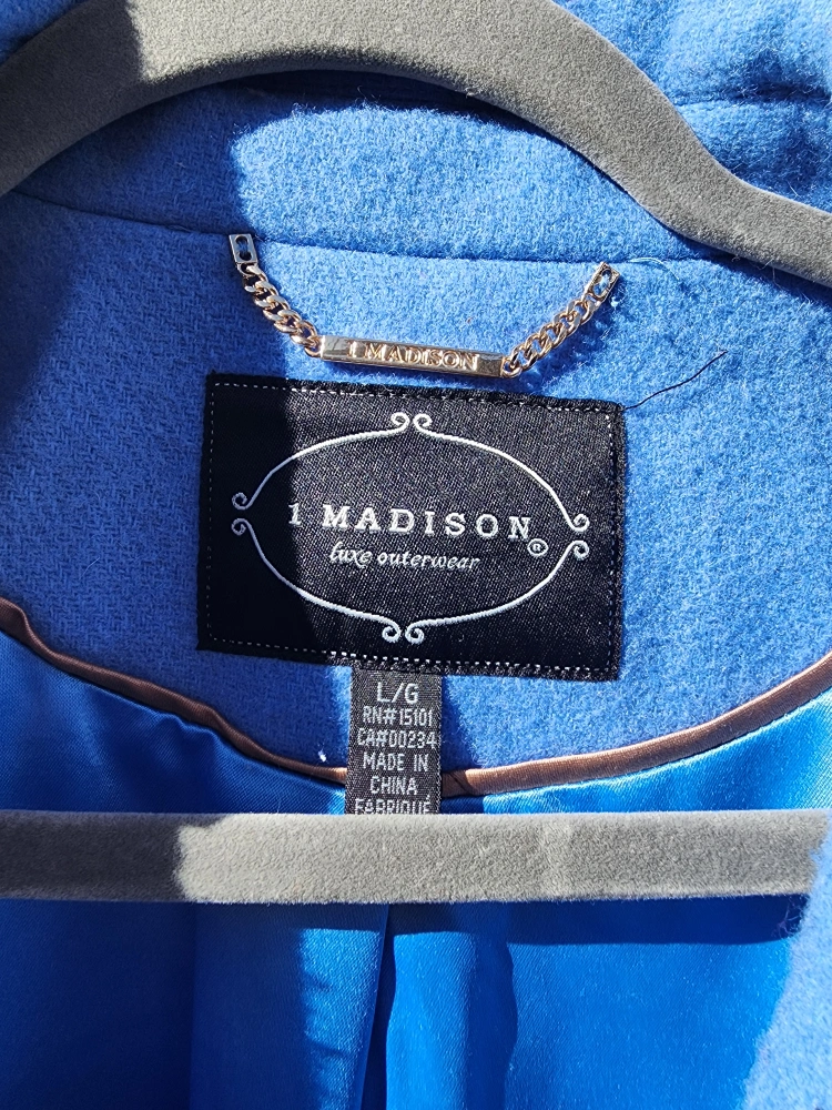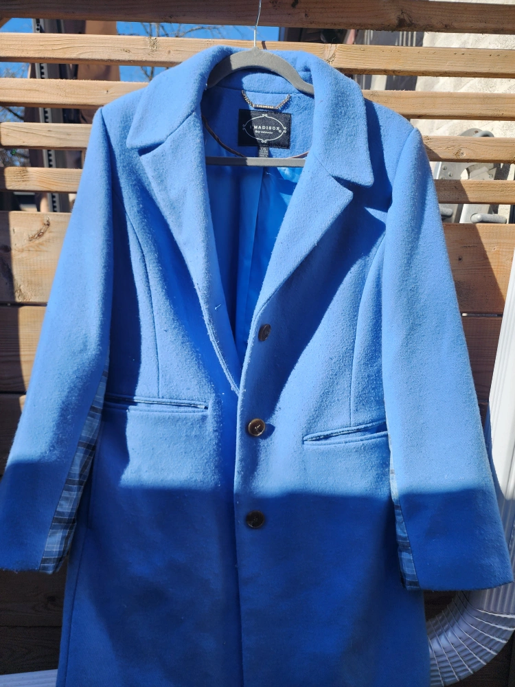 199Women's blue coat. Features plaid accents on sleeves and pockets. Long sleeves, button closure. Beautiful blue colour. Wool blend.