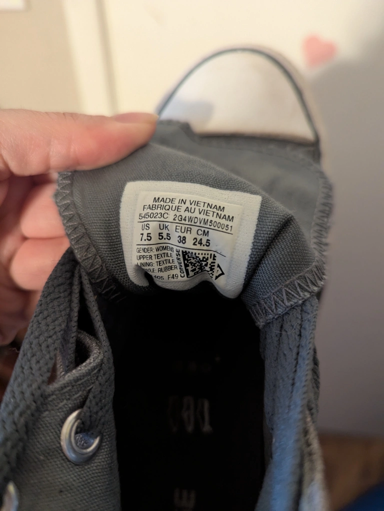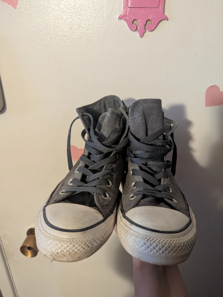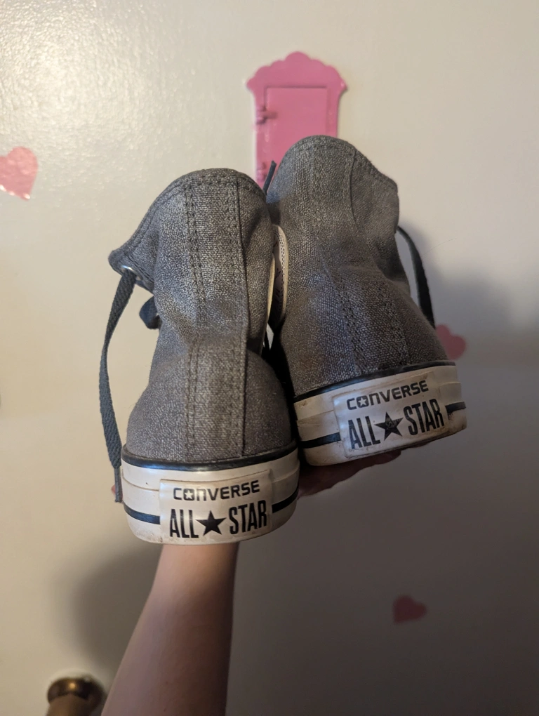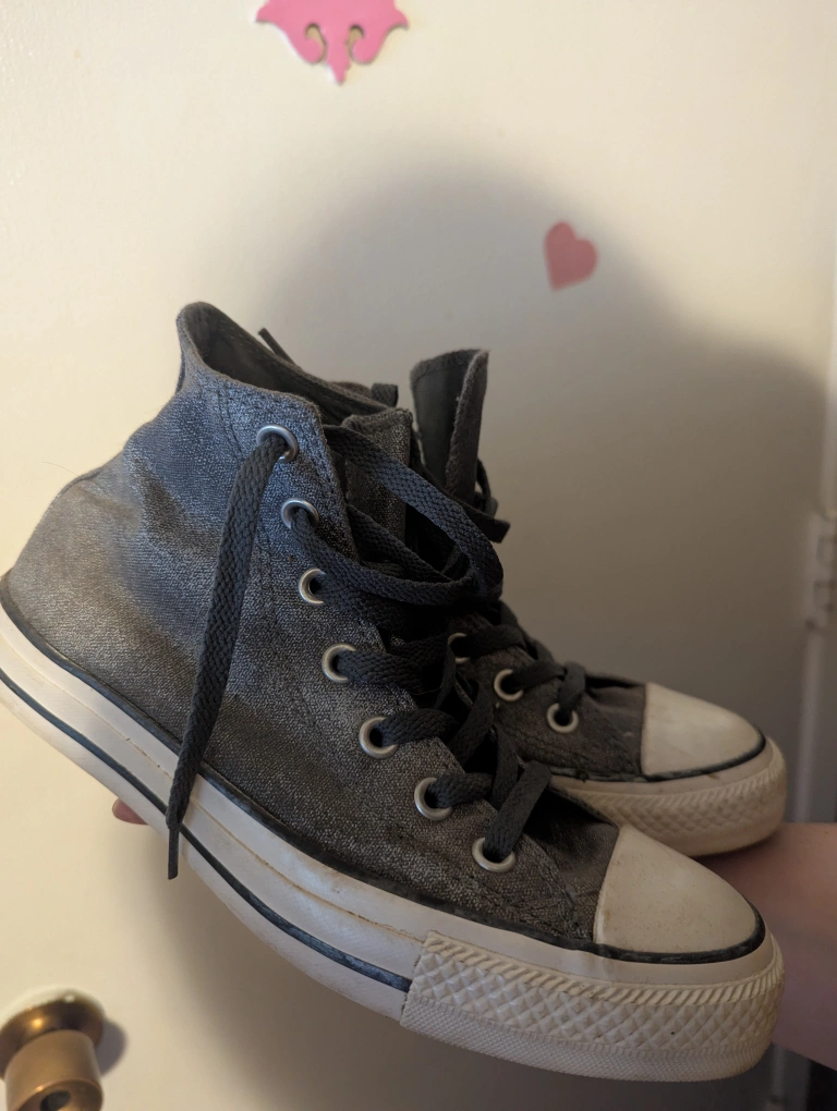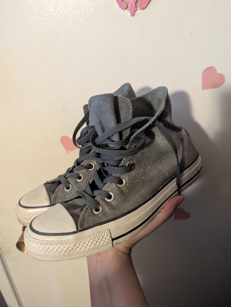 Grey high top Converse sneakers in 7.5/38 Classic style. Pre-owned but good condition. Pickup in Beltline.