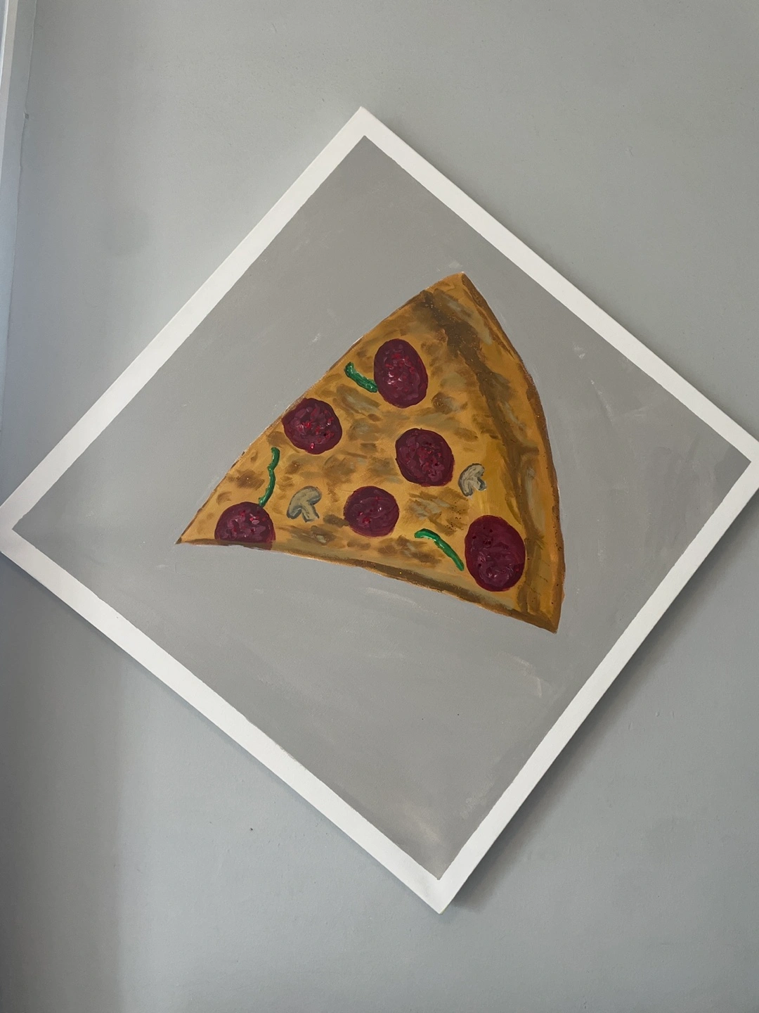 388Hand-painted canvas featuring a slice of pizza. Gold glitter accents. Grey background. Square canvas.