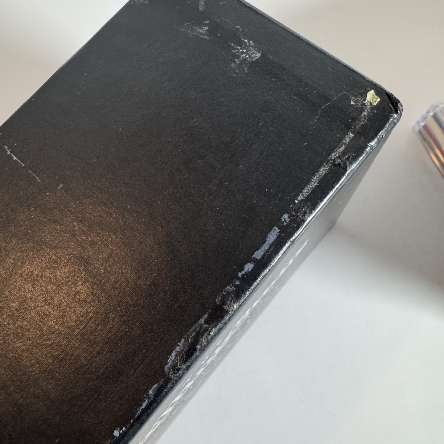 The black cardboard box container has some minor damage. See pictures.