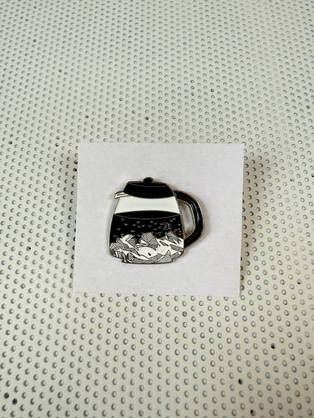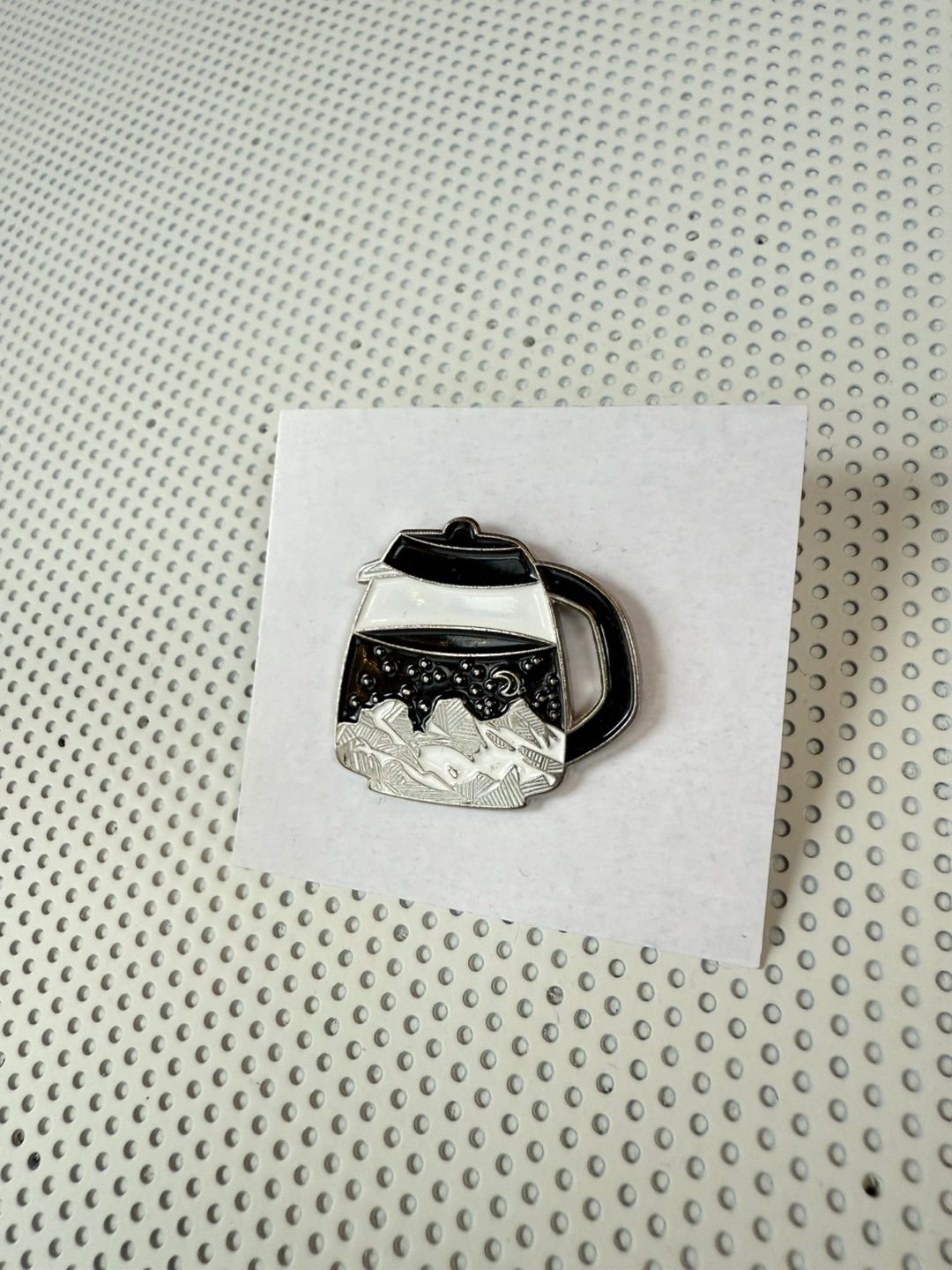 Stylish enamel pin featuring a black, white, and silver teapot/kettle with a starry sky and mountain scape design. Nee, never used; measures 1-½” x 1” ⛰️ 🫖 Perfect for adding flair and sophistication to any outfit or mood board (use as fancy push pins). Excellent gift for coffee lovers! ☕️ I have over 40 pins for sale, see the last photo for the whole selection, check out my page for more details! 🧷 cute and collectible