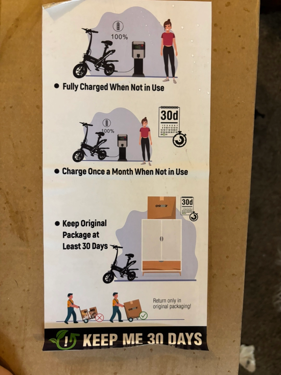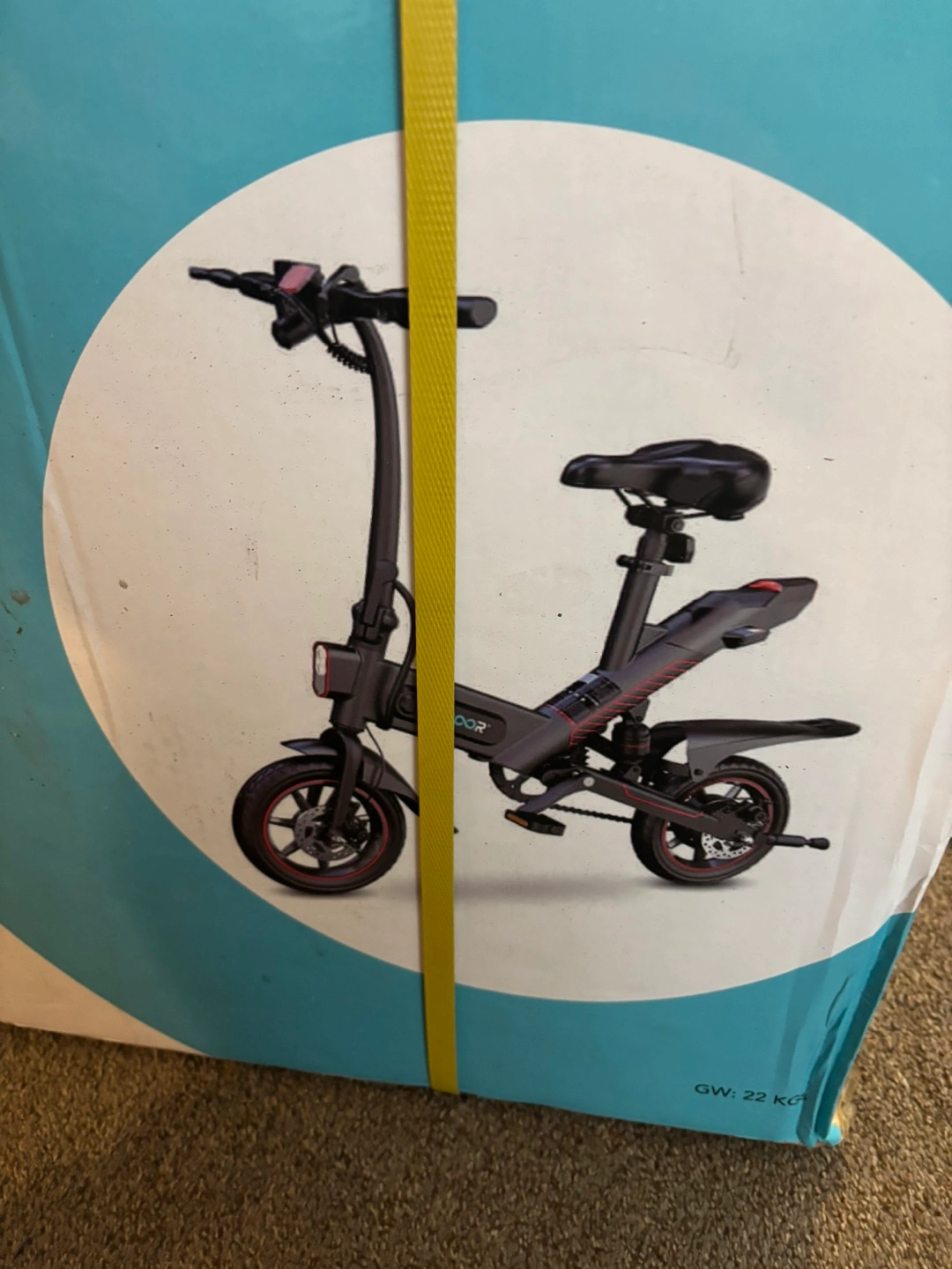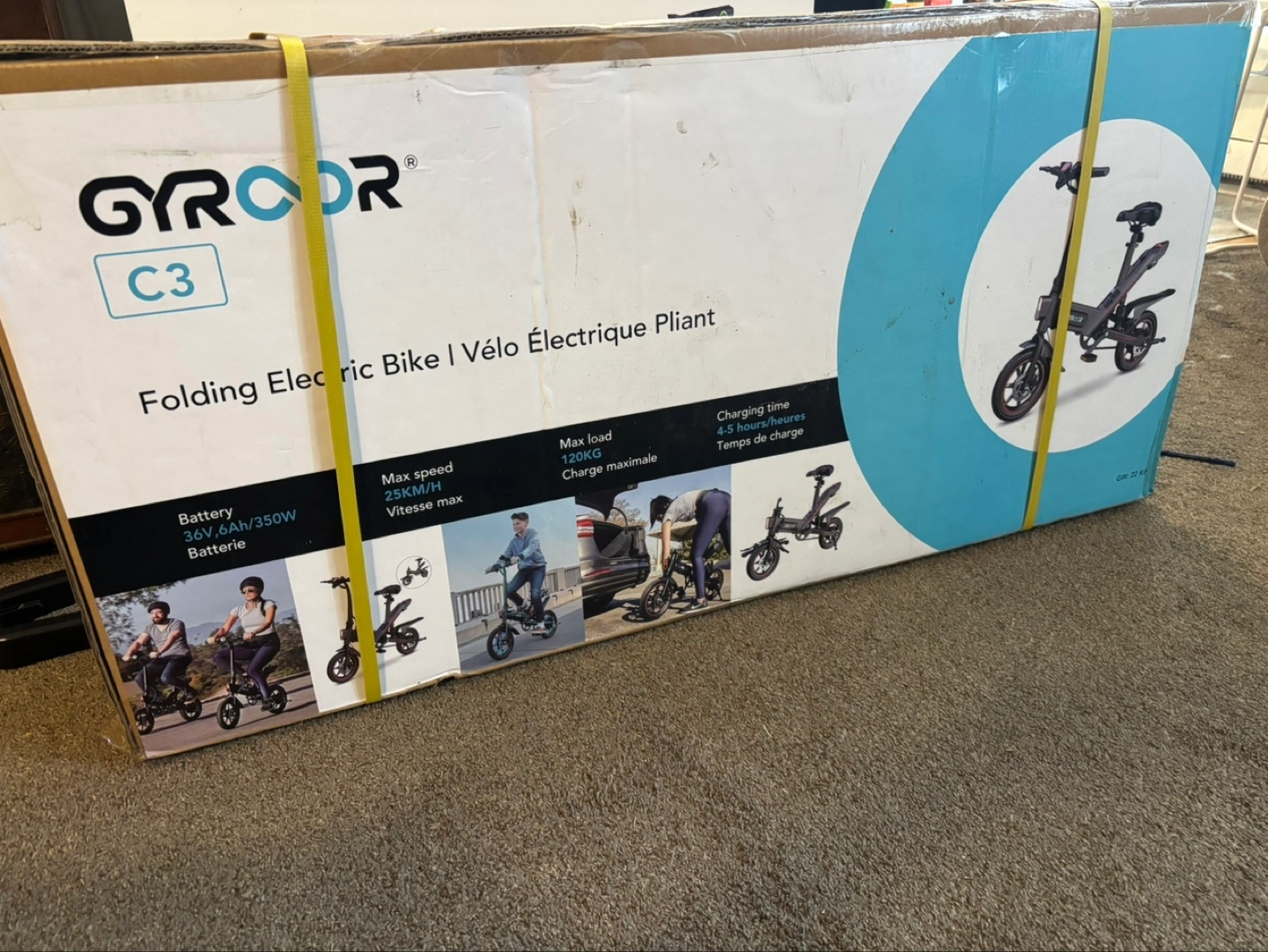 New Gyroor C3 folding electric bike. Includes 36V 6Ah/350W battery. Max speed 25KM/H. Max load 120KG. Charging time 4-5 hours. Lightweight and portable design. Perfect for commuting or short trips.