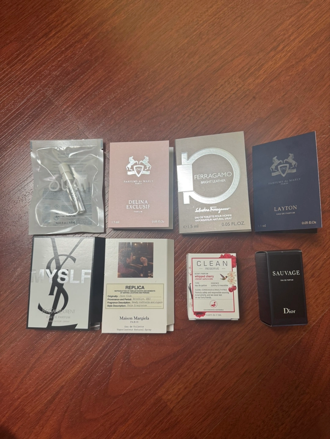 Collection of perfume samples. Includes brands like Parfums de Marly, Salvatore Ferragamo, Maison Margiela, and Dior. Great for testing scents before committing to a full bottle.