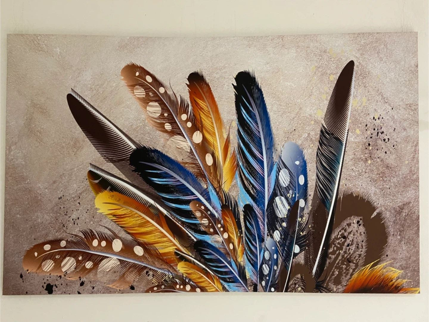 Canvas print featuring a collection of vibrant feathers in various colours and designs. It's a striking piece for home decor.