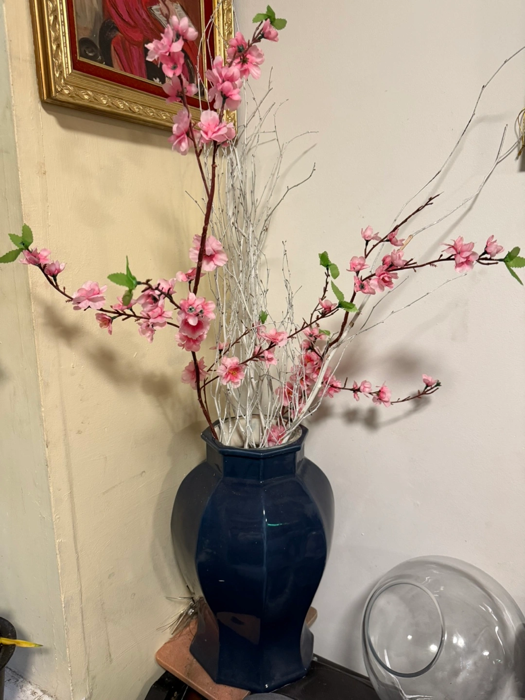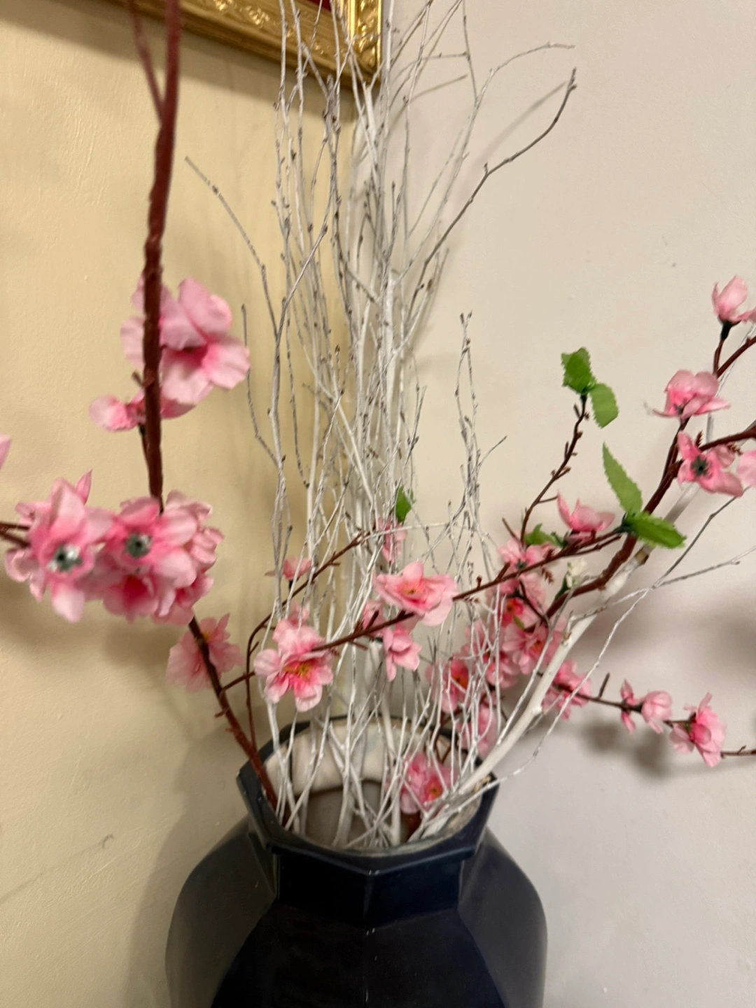 Blue Ceramic Vase with Pink Flower and White Branch Arrangement