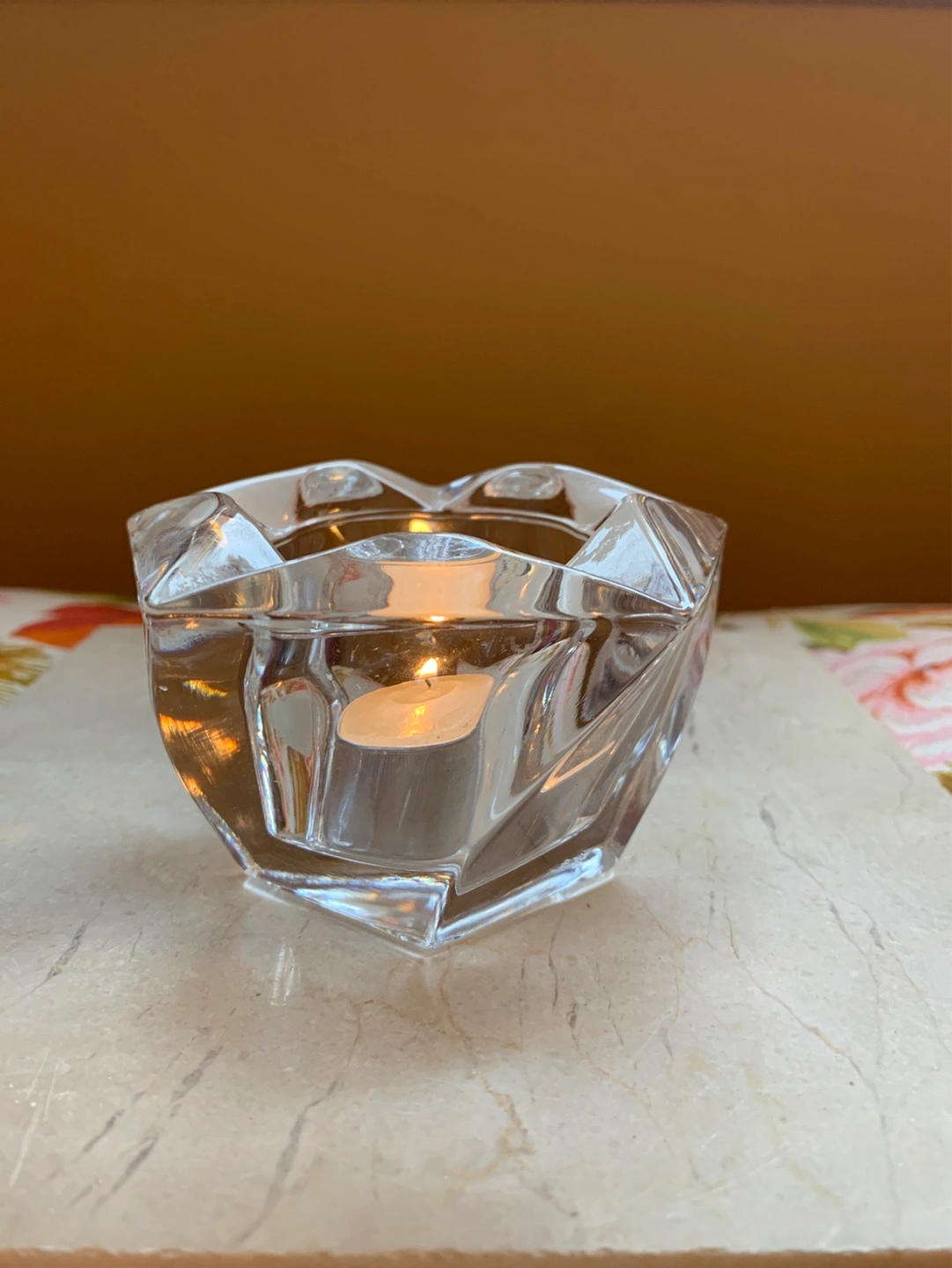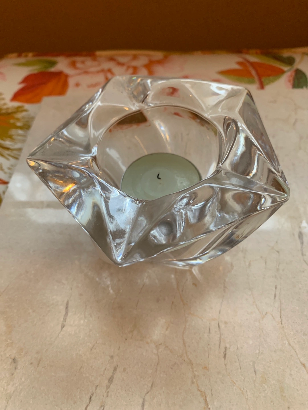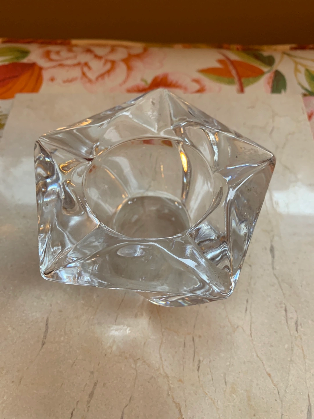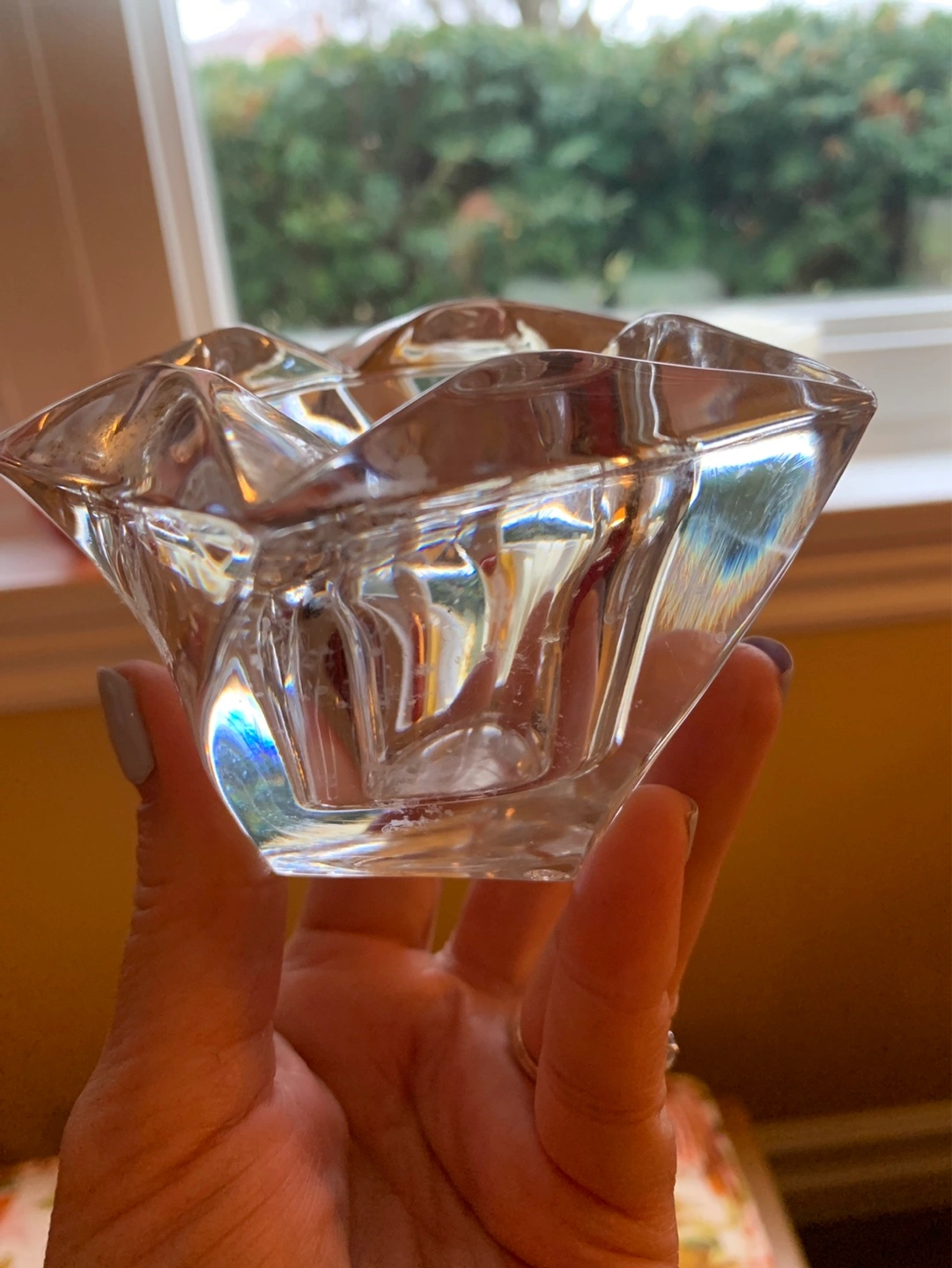 A unique shaped heavy glass votive candle holder or for a tea light. It has faceted glass which is pretty thick. Perfect for tea lights, small votives or small pieces of jewelry like rings. Adds a touch of elegance to any space. Pretty at night with a candle. Cash only please.
