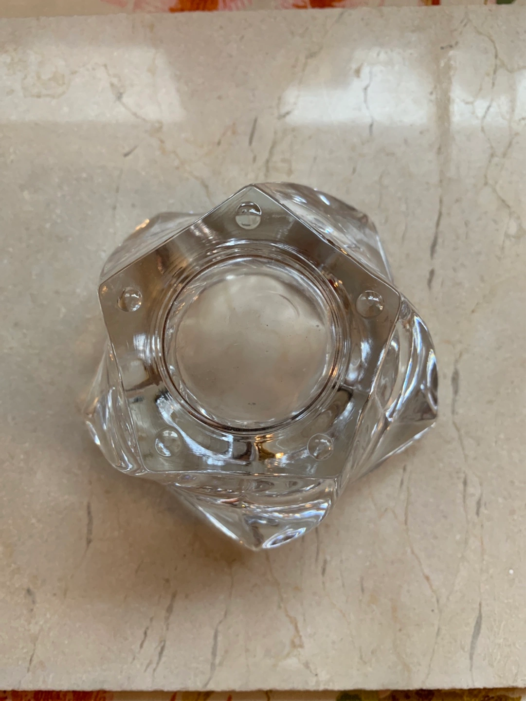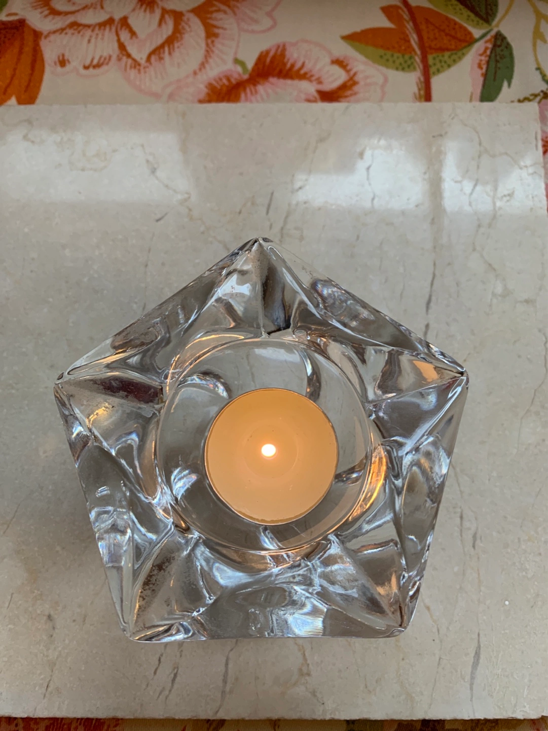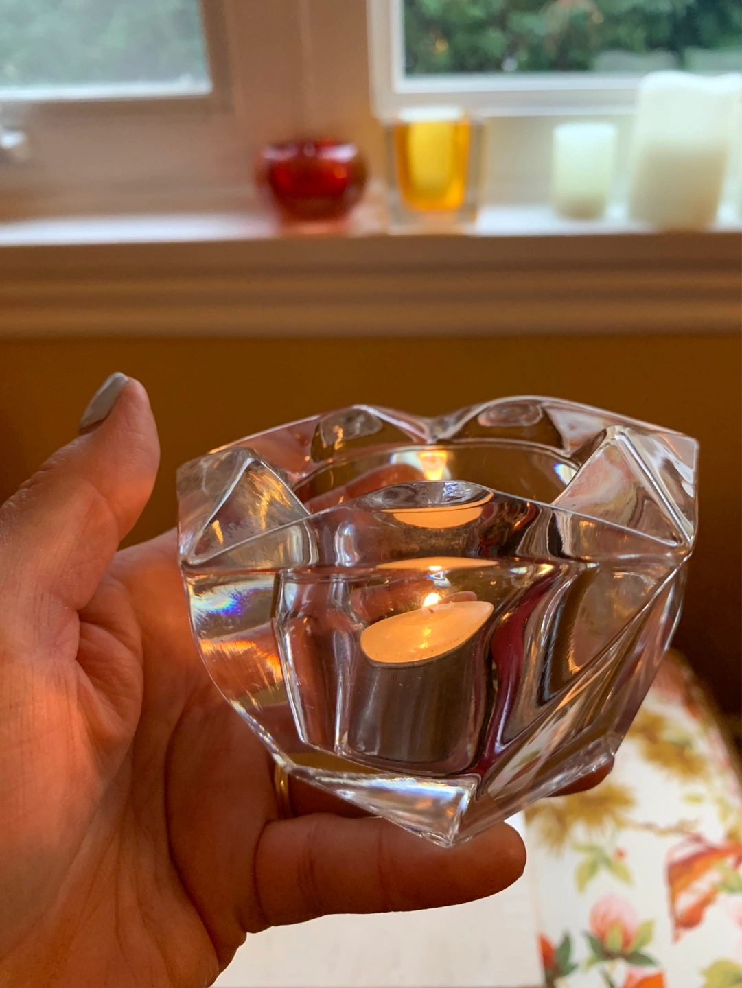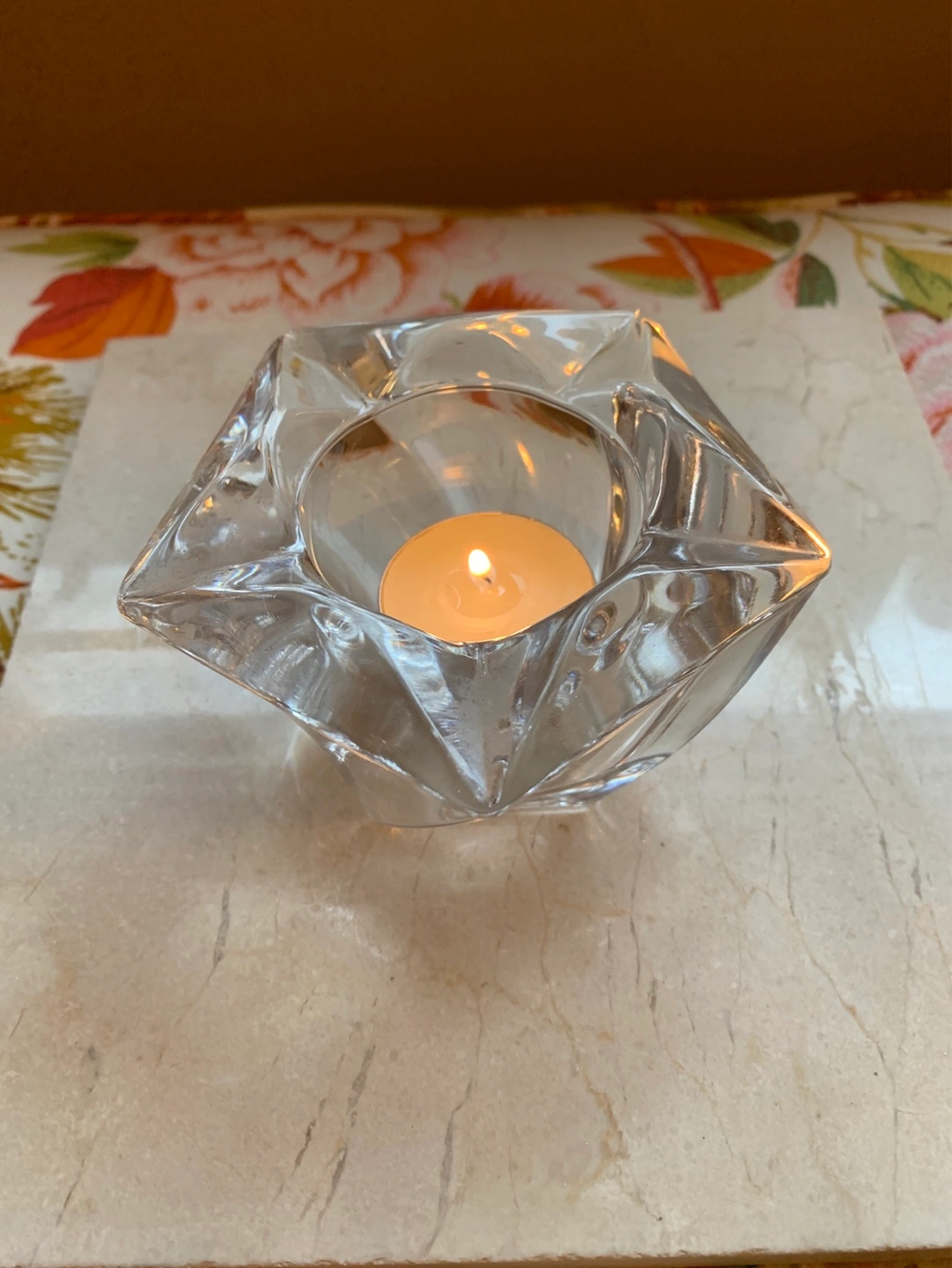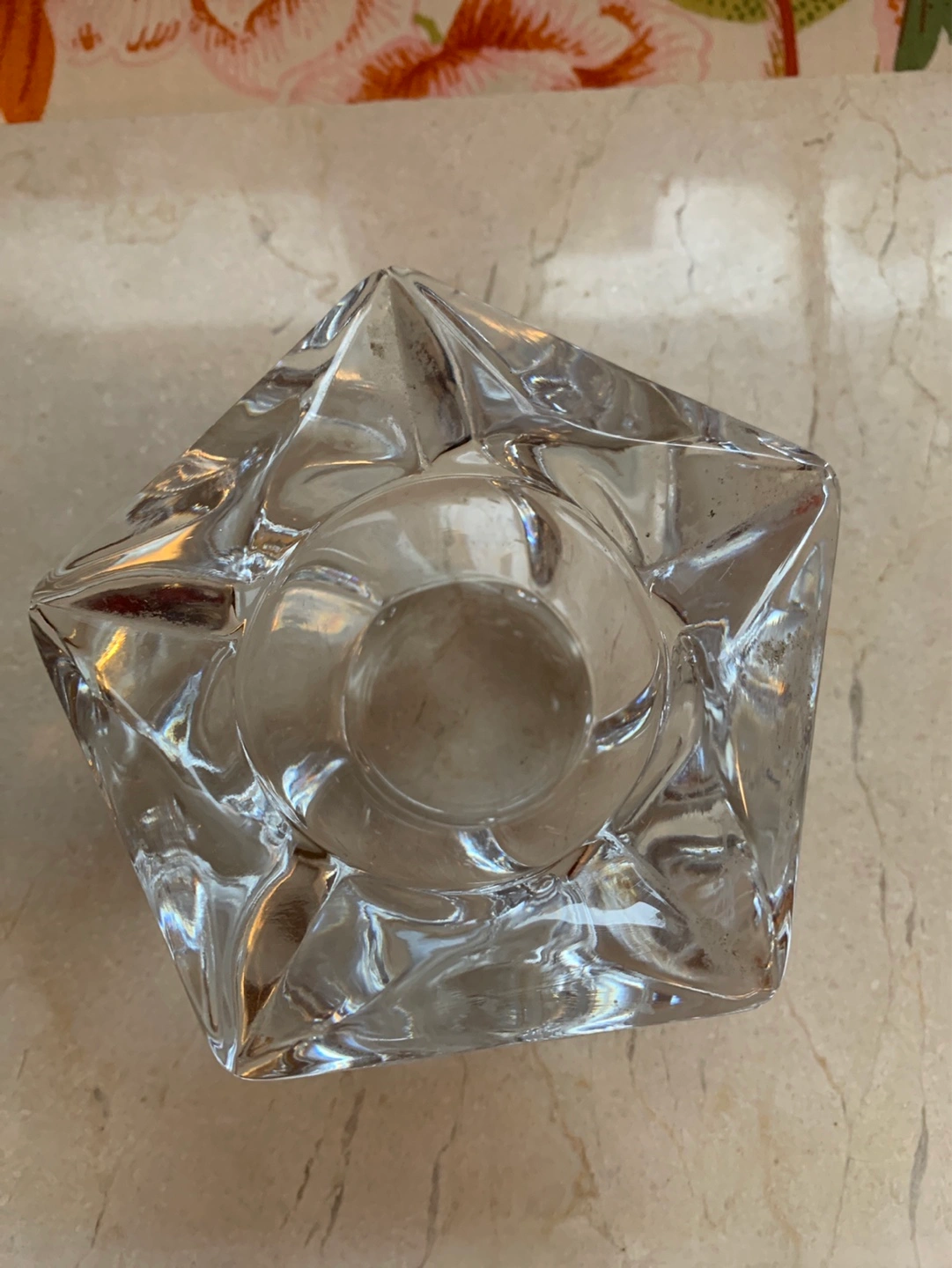 A unique shaped heavy glass votive candle holder or for a tea light. It has faceted glass which is pretty thick. Perfect for tea lights, small votives or small pieces of jewelry like rings. Adds a touch of elegance to any space. Pretty at night with a candle. Cash only please.