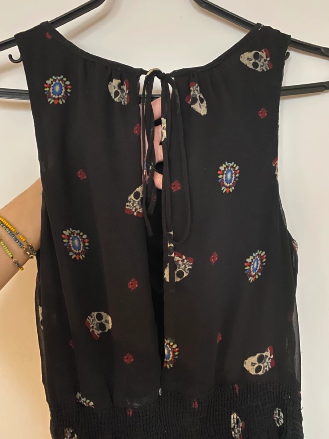 800Black patterned Zara/Trafaluc dress purchased in 2010. Rare find I suppose! I’m 5’3 and it’s knee length on me. Open shoulders. Has a long slit on the back, with a tie string at the top. Very flows and breathable! The pattern has hidden skulls. In good condition, no rips or stains. I loved this dress and took good care of it. Getting rid as it’s not my style anymore! Pick up near Greektown.