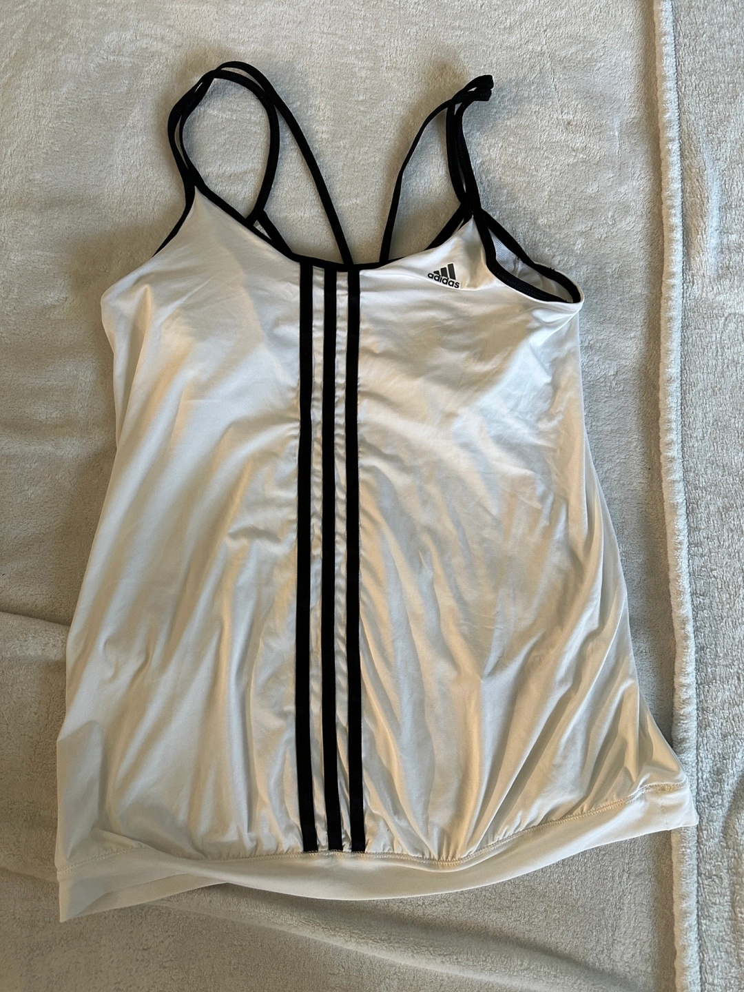 Women's white tank top. Climalite fabric. Black accents. Built-in bra. Racerback style. Great for workouts.