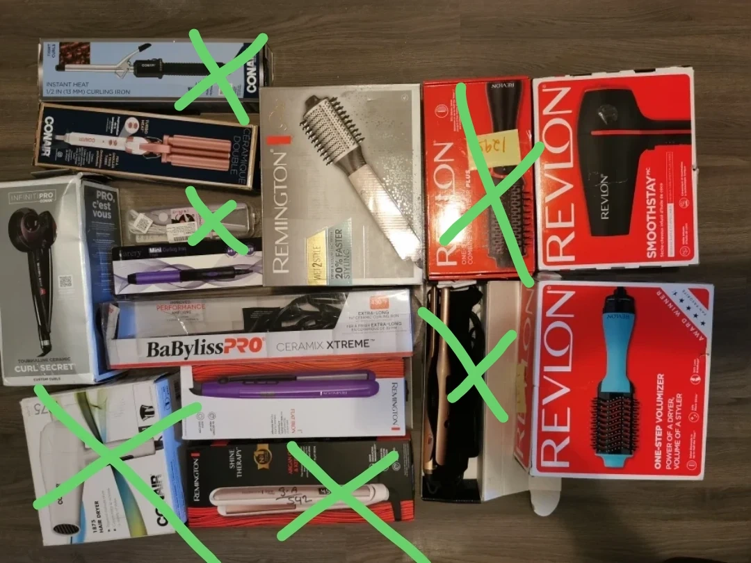 Large bundle of various hair styling tools. Includes curling irons, flat irons, hair dryers, and brushes. Brands include Conair, Revlon, Remington, and Babyliss Pro.
