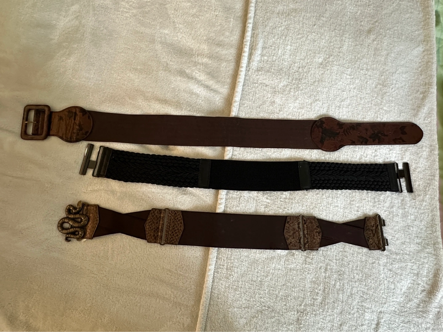 Bundle of three women's belts. Brown elastic belts with unique buckles. One features a snakeskin pattern. Another black woven elastic belt. Great for adding style to any outfit.