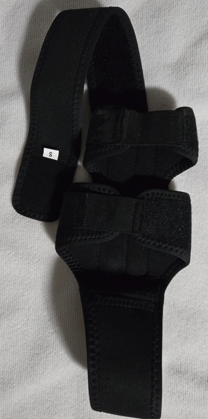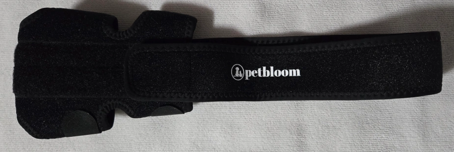 Black neoprene dog leg brace. Size small. Adjustable straps. Supports injured or recovering legs.