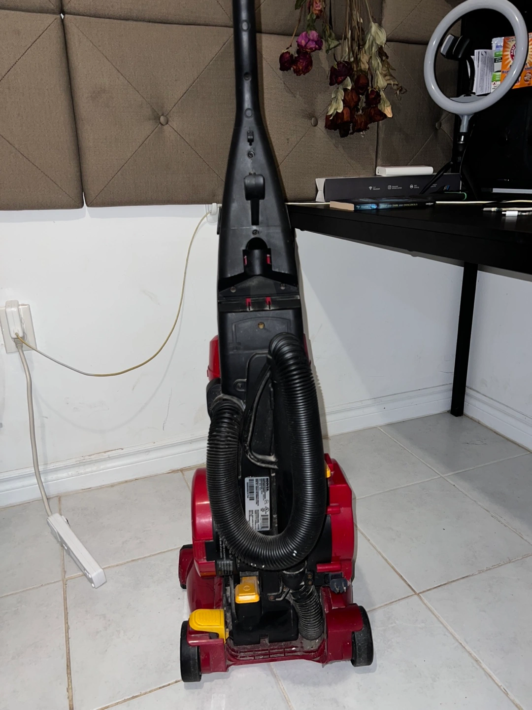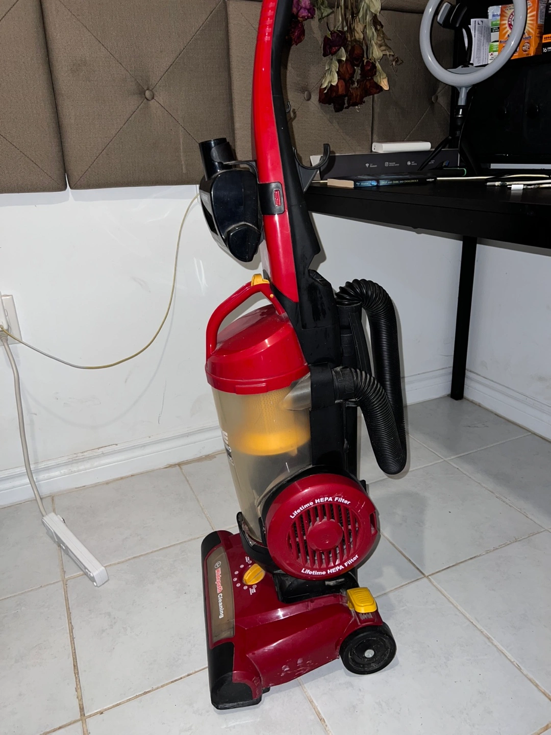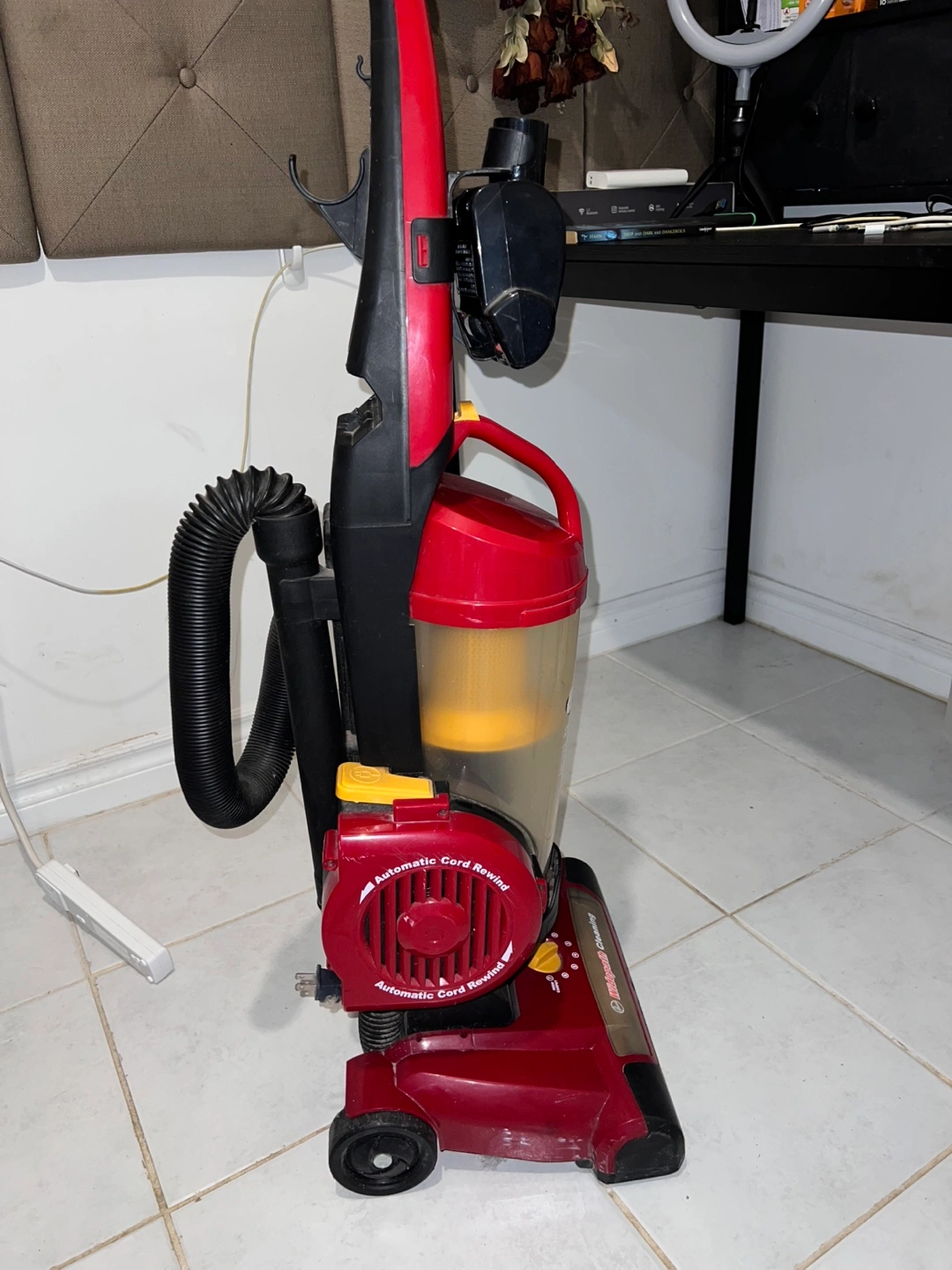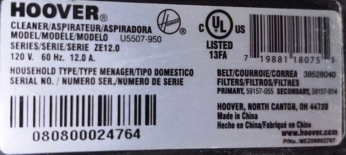 Hoover Vacuum Model U5507-950. Automatic cord rewind. Lifetime HEPA filter. Good condition.