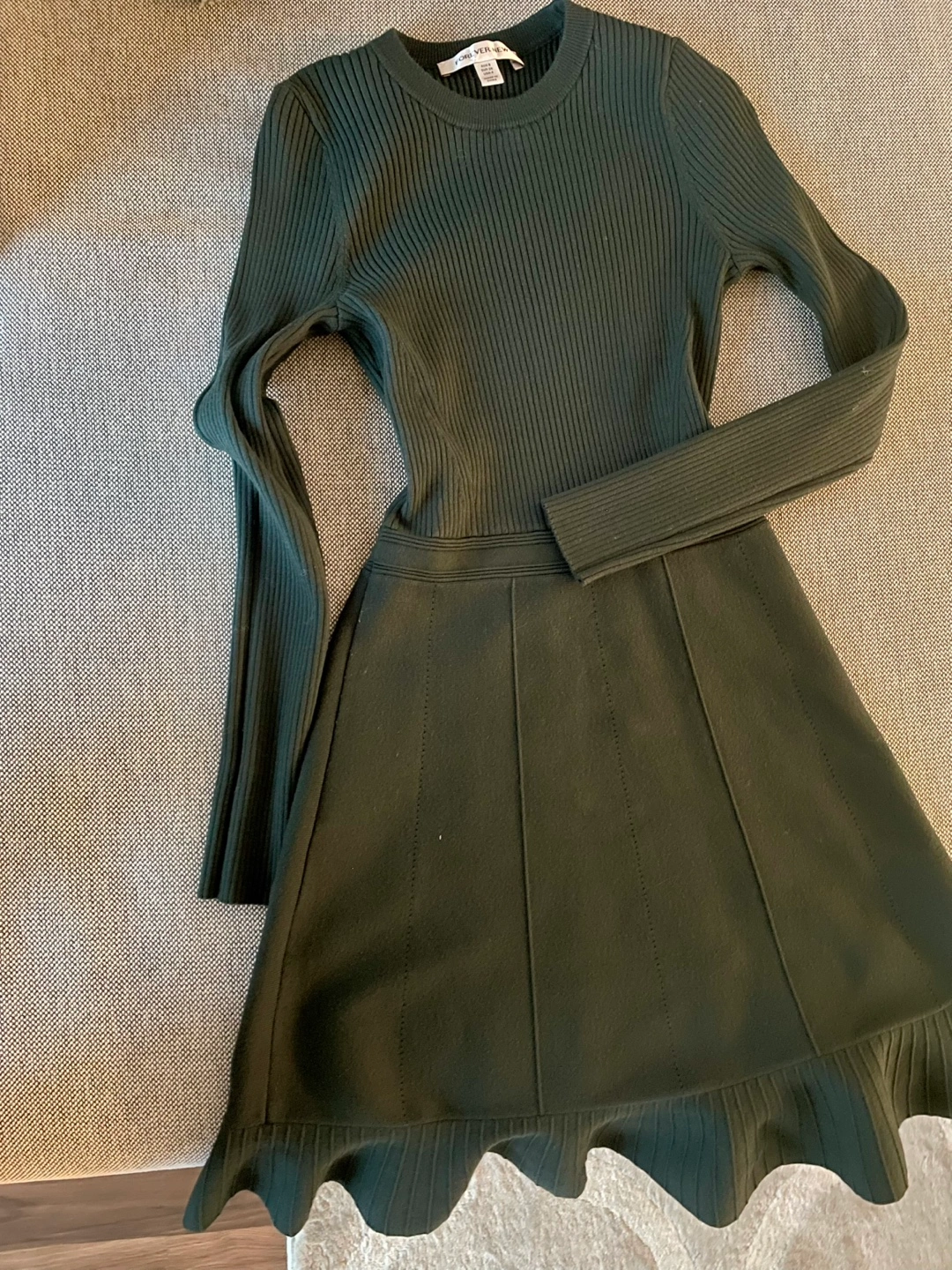 Dark green ribbed knit sweater dress. Long sleeves, round neckline, and a fit and flare silhouette. Size small.