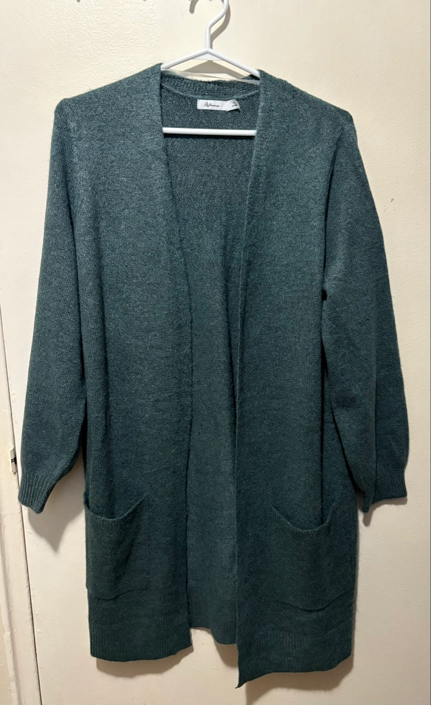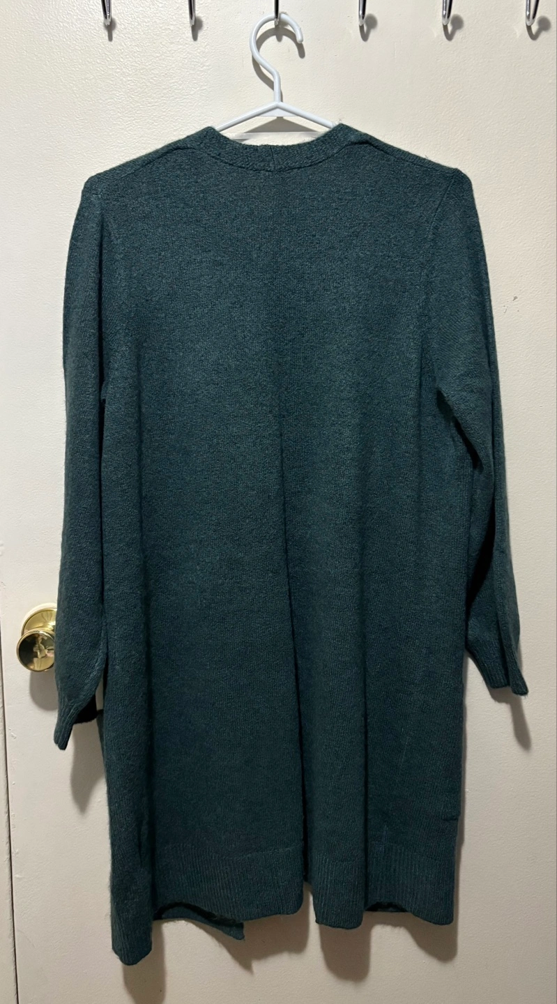 Dark teal green long cardigan. Open front. Long- sleeves. Side pockets. Soft material. Size L Petite. In excellent condition.