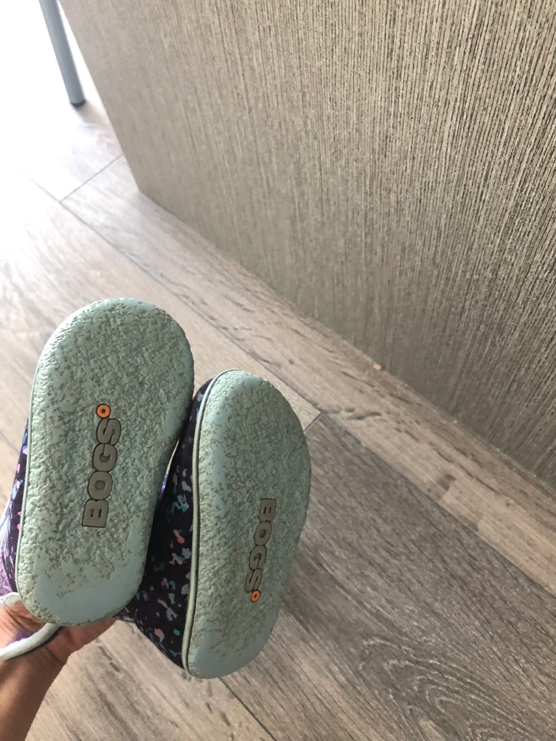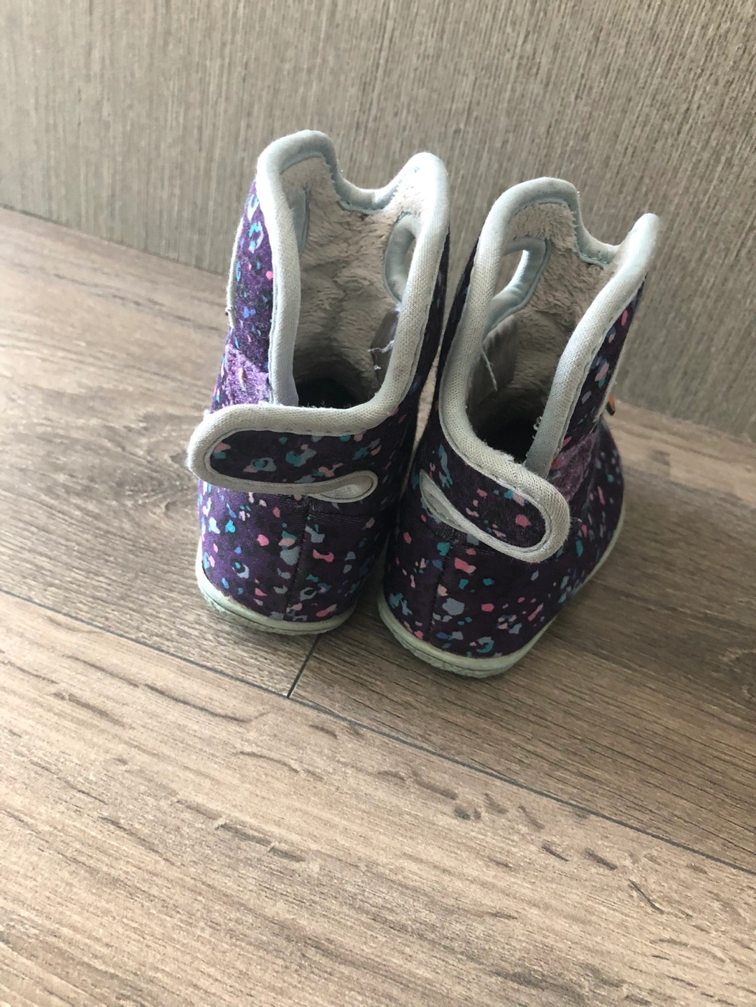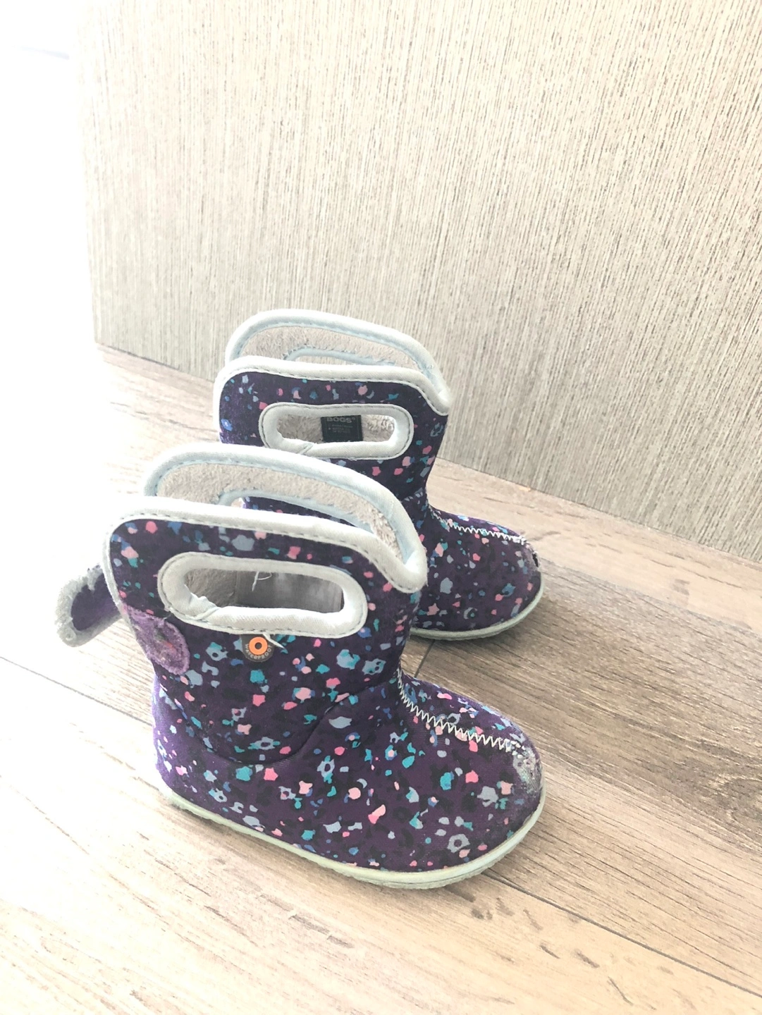 Adorable Bogs baby boots. Purple with colourful spots. Size 4, fits 6-12 months. Good used condition. Soft, warm lining. Easy to put on and take off.
