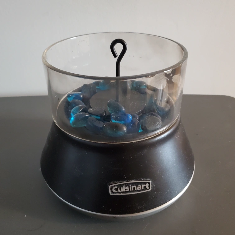 Glass and black base. Includes blue glass pebbles. Used, but in good condition.