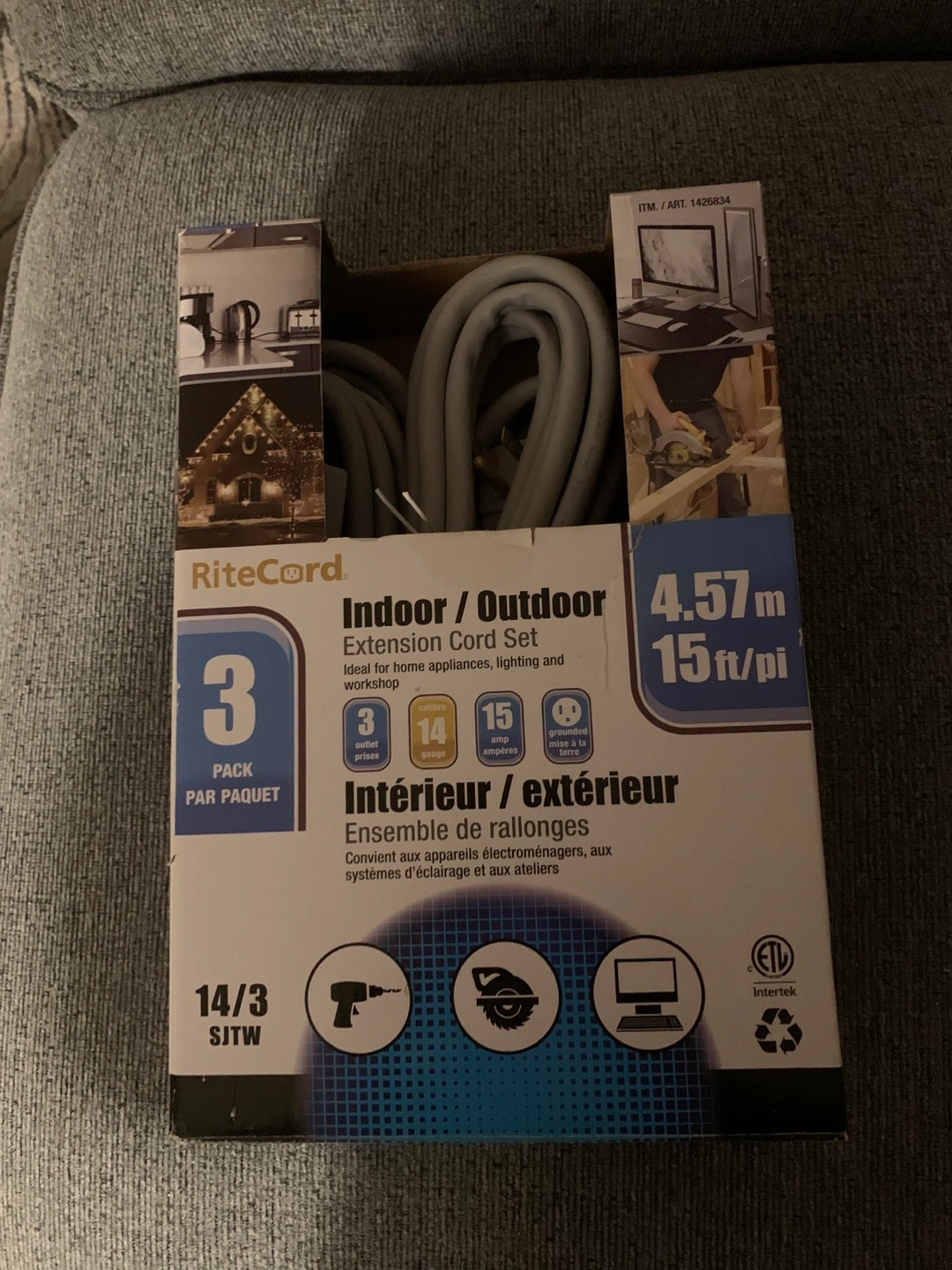 4342 15-foot indoor/outdoor extension cords. 14/3 SJTW. Ideal for home appliances, lighting and workshops. I used one and am selling the 2 that I am not using.