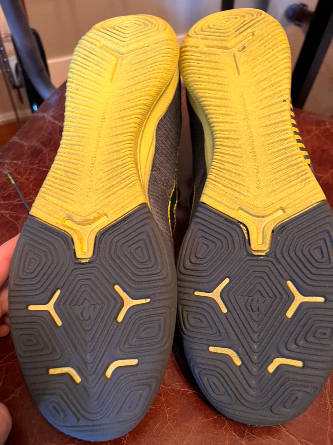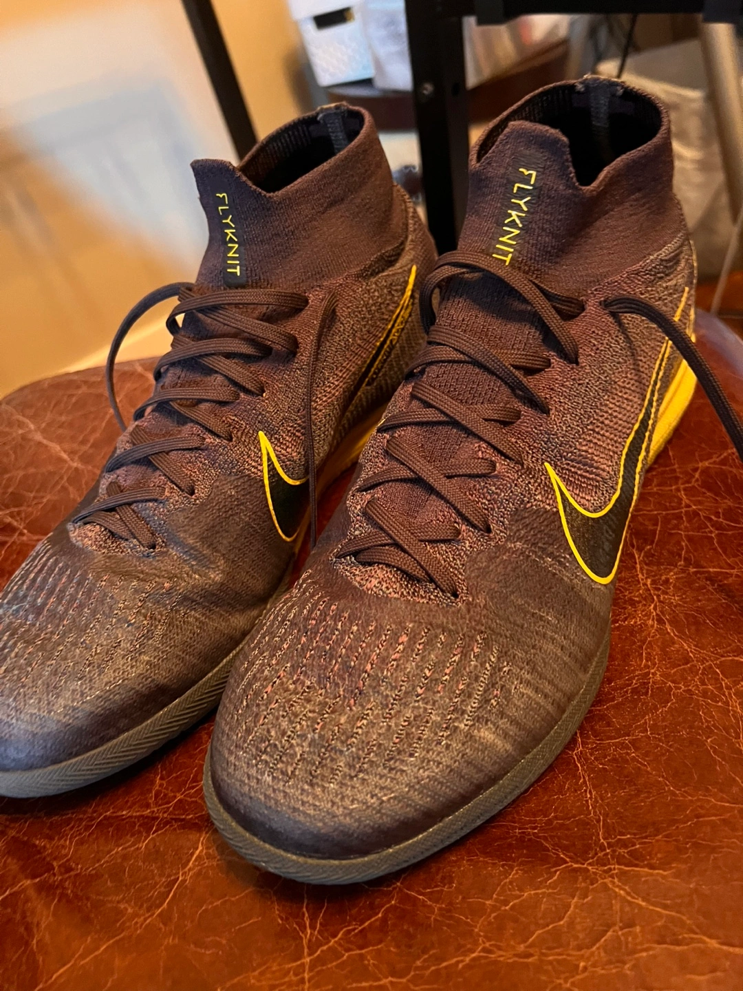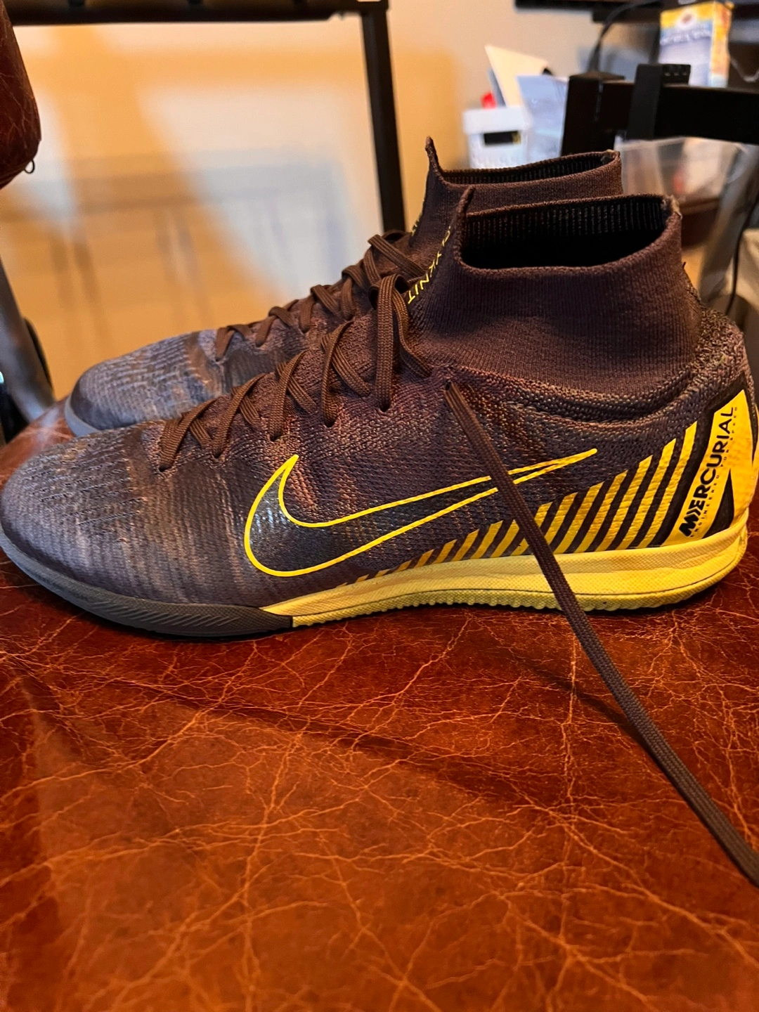 Barely Used Nike Mercurial Flyknit indoor soccer shoes. Dark grey/purple colour with yellow accents. High top design. Flyknit upper. Great condition. Size 9.5