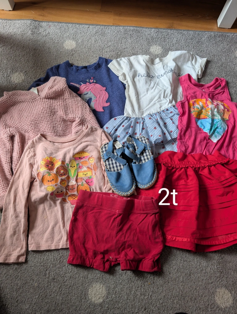 Seven-piece girls' clothing bundle, size 2T. Includes long-sleeve shirts, dresses, shorts, and a pair of shoes. (size 7) Pickup only St Clair East and O'Connor