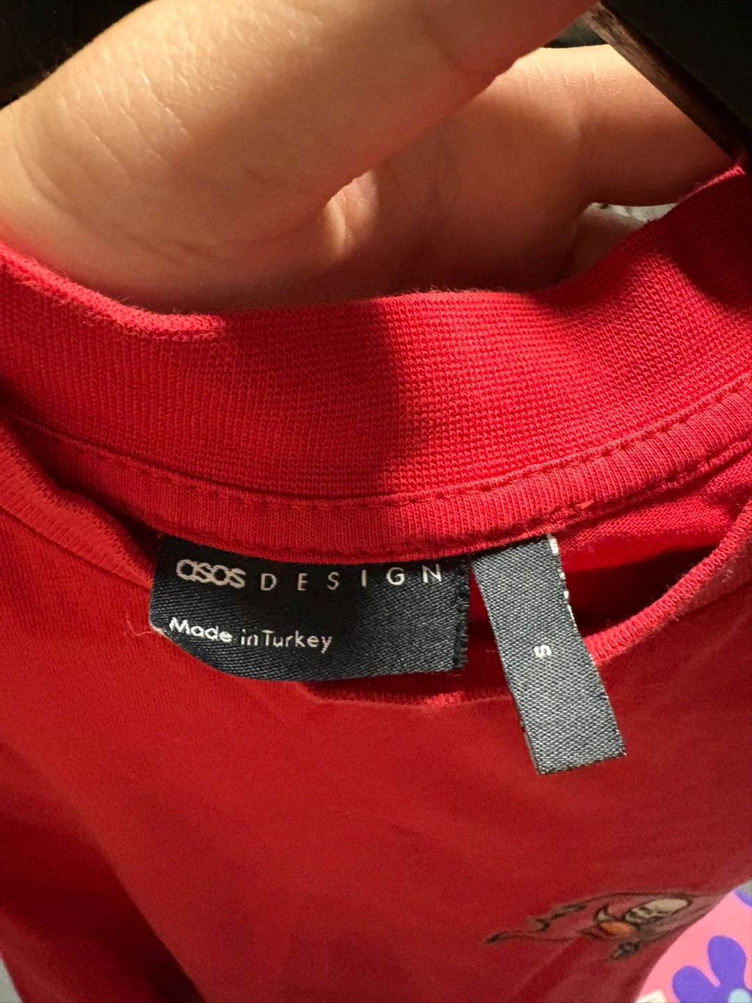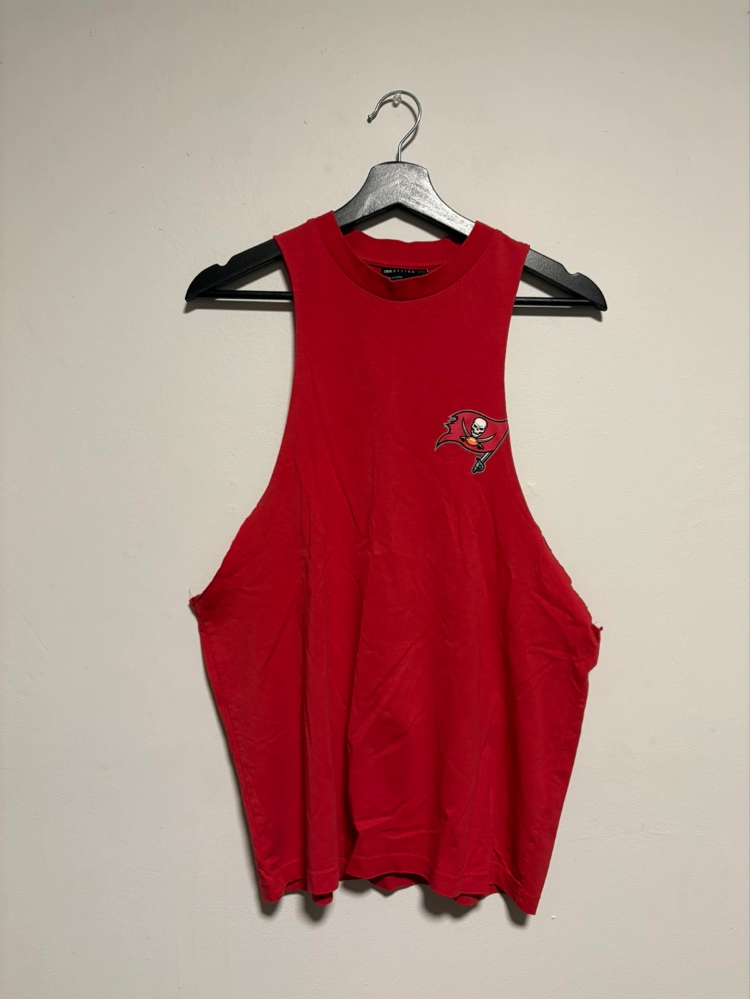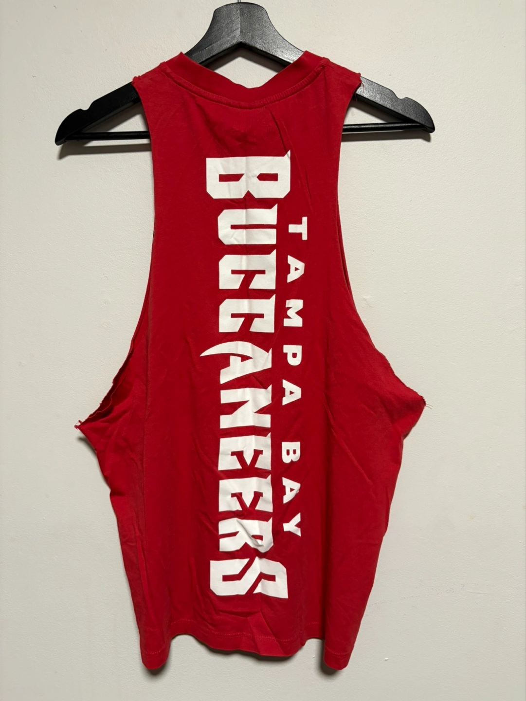 Red sleeveless shirt. Features Buccaneers logo and lettering. Size S