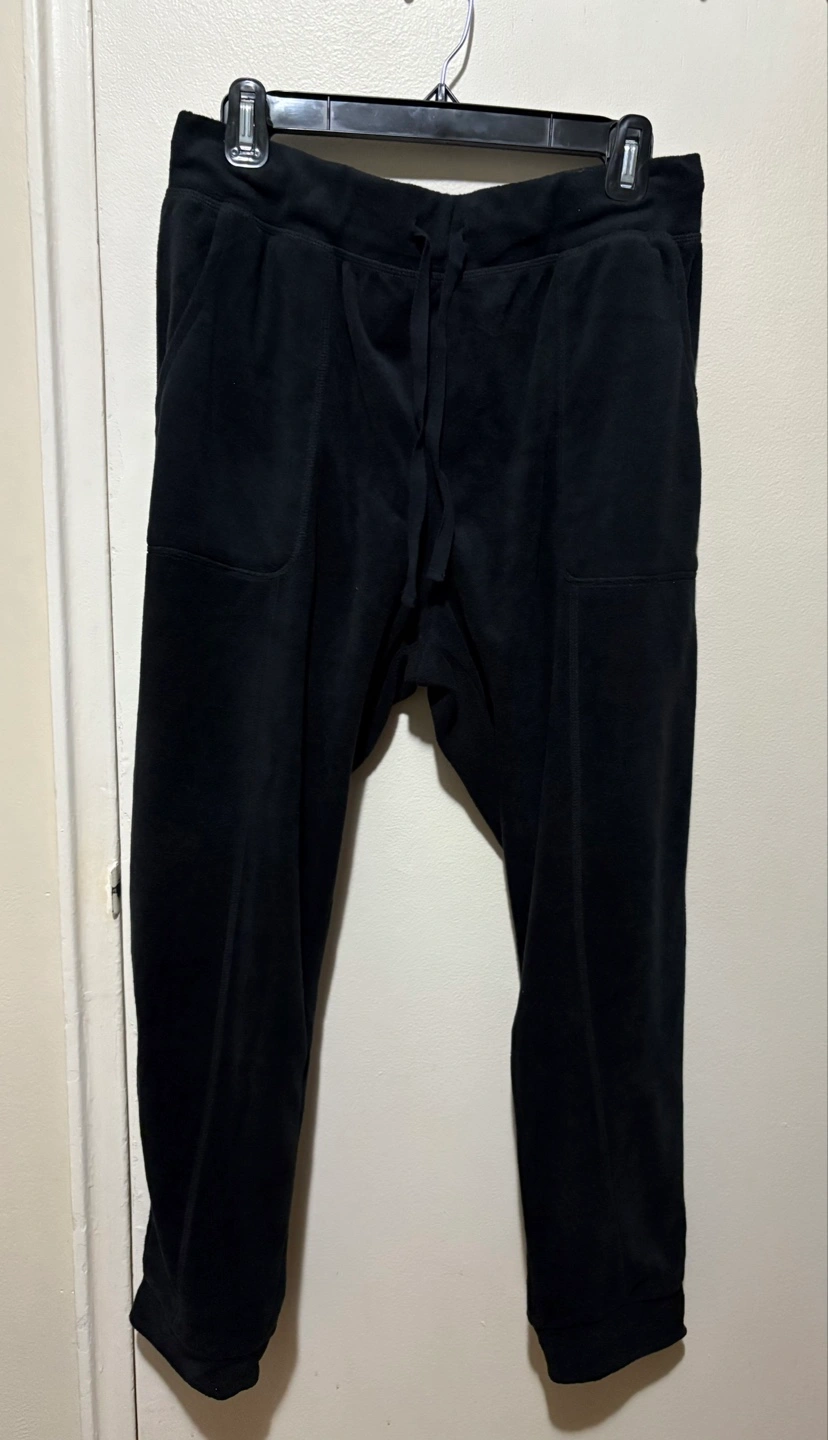 Cozy black fleece pants. Drawstring waistband. Side pockets. Medium size. Excellent for lounging or casual wear.